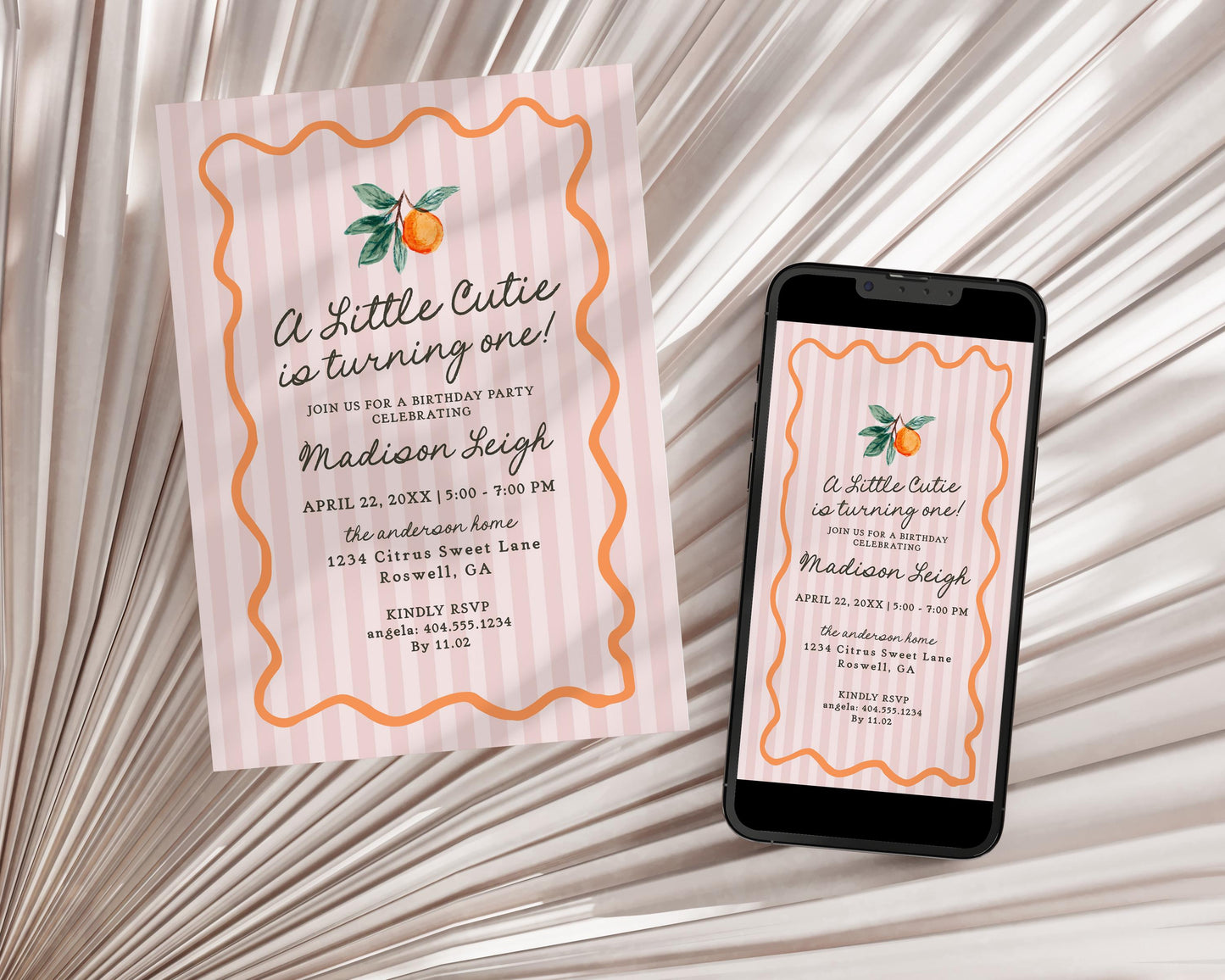 Pink Little Cutie First Birthday Invitation Printable Template, Pastel Citrus Bday Party Decor for Retro Summer 1st Birthday WP1050
