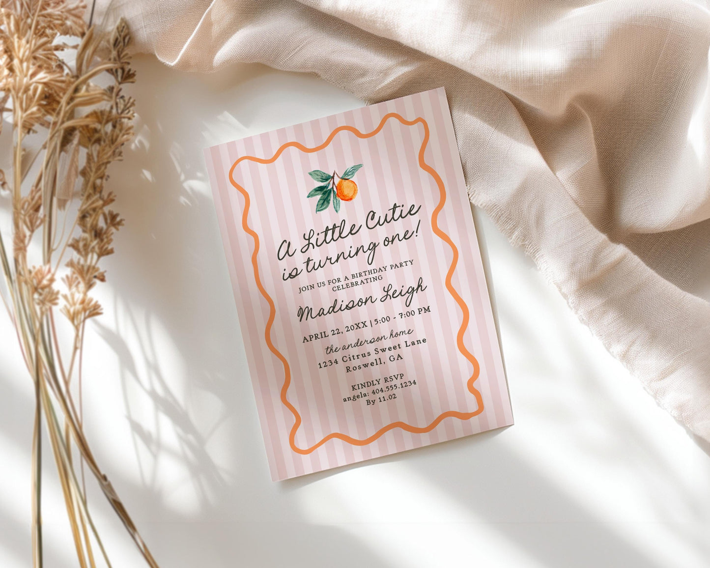 Pink Little Cutie Birthday Invitation Printable Template, Pastel Citrus Bday Party Decor for Retro Summer Birthday WP1050