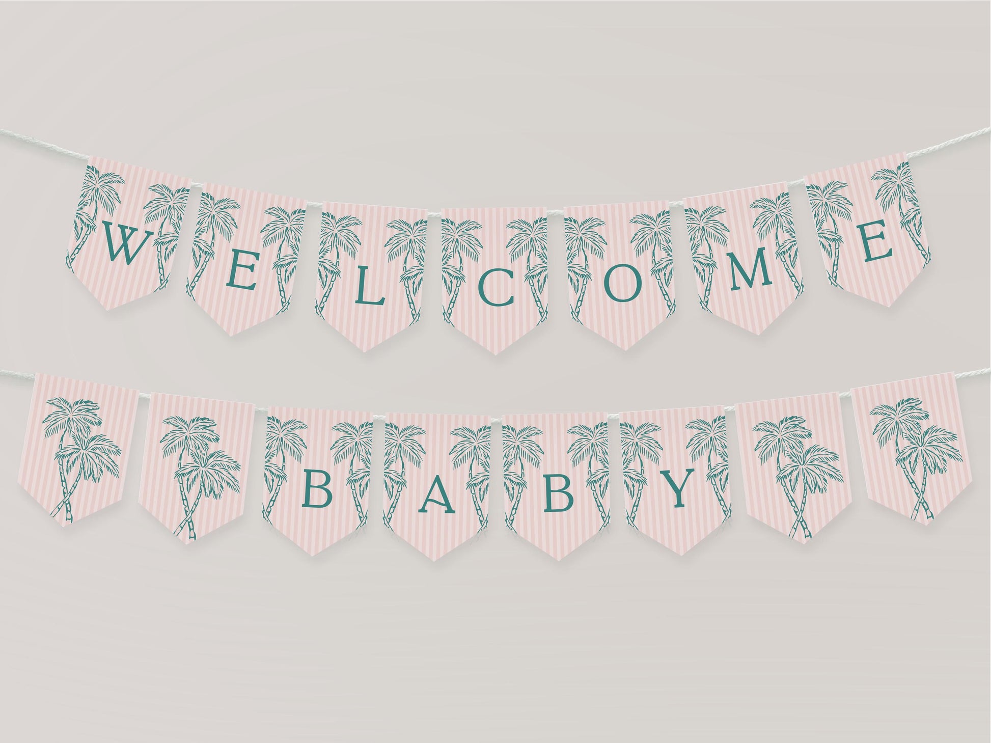 Pink Palm Springs Baby Shower Banner Template, Vintage Palm Tree Beach Cabana Baby Sprinkle, Retro Tropical Pastel Nesting Party WP1046