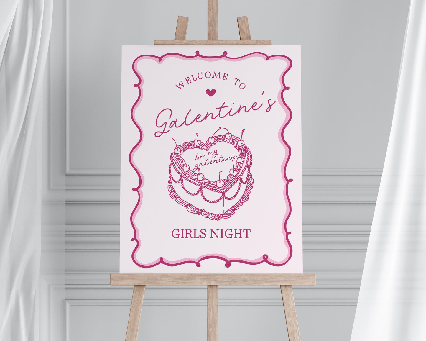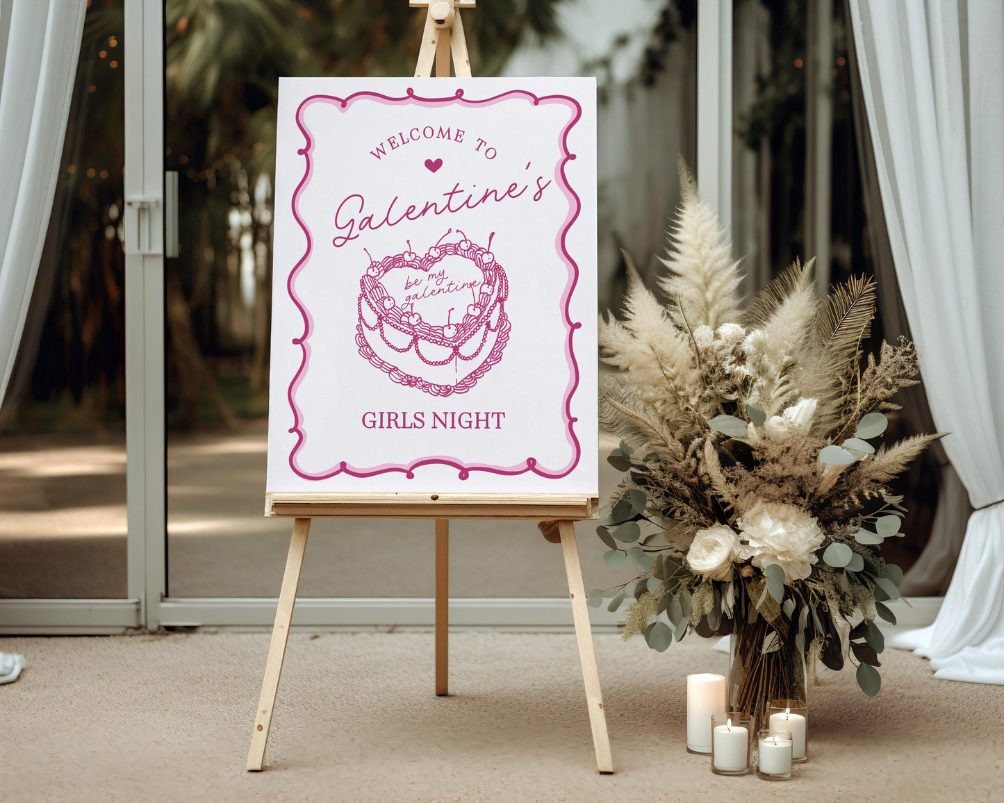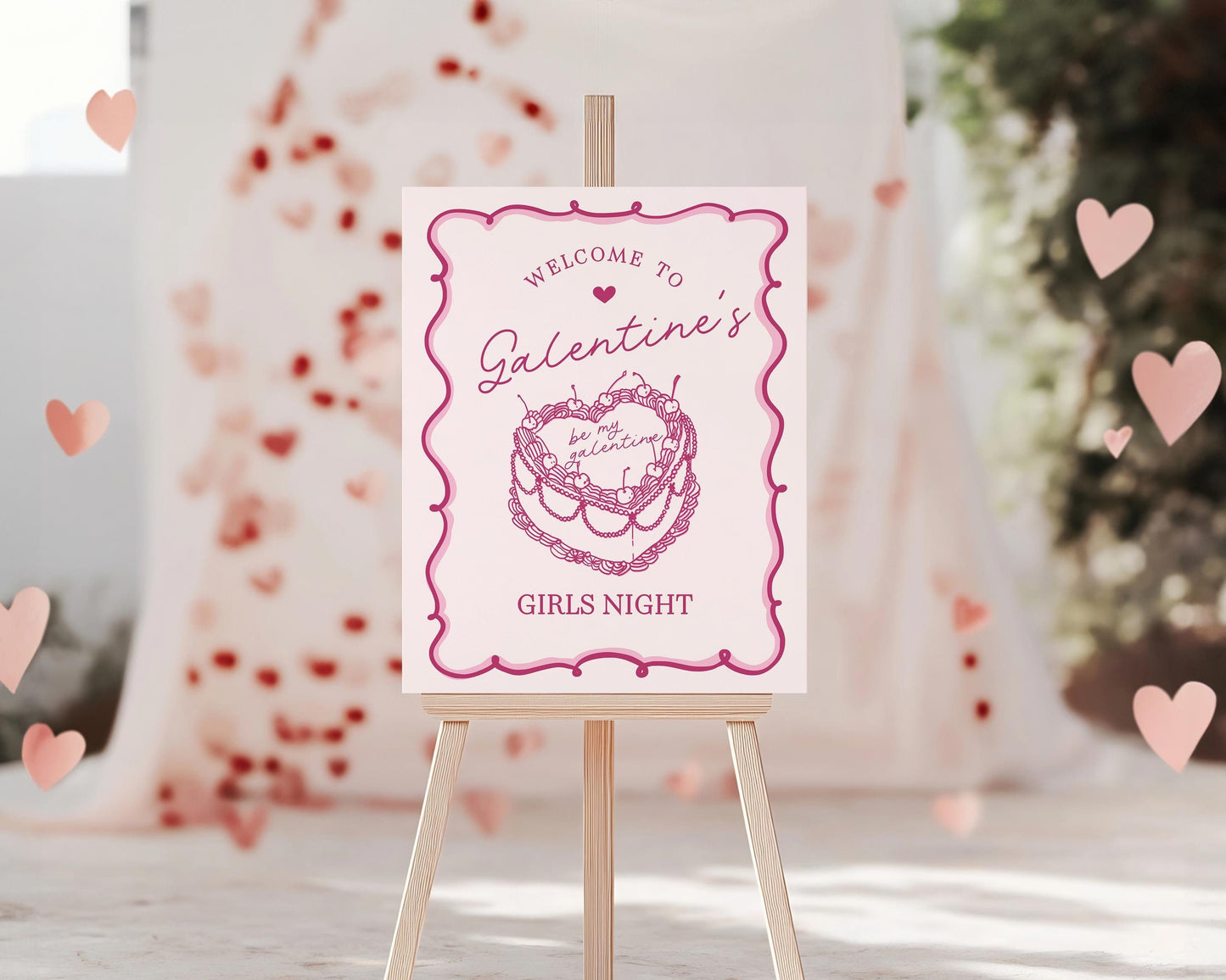 Pink Retro Coquette Heart Cake Galentines Party Welcome Sign Printable Template