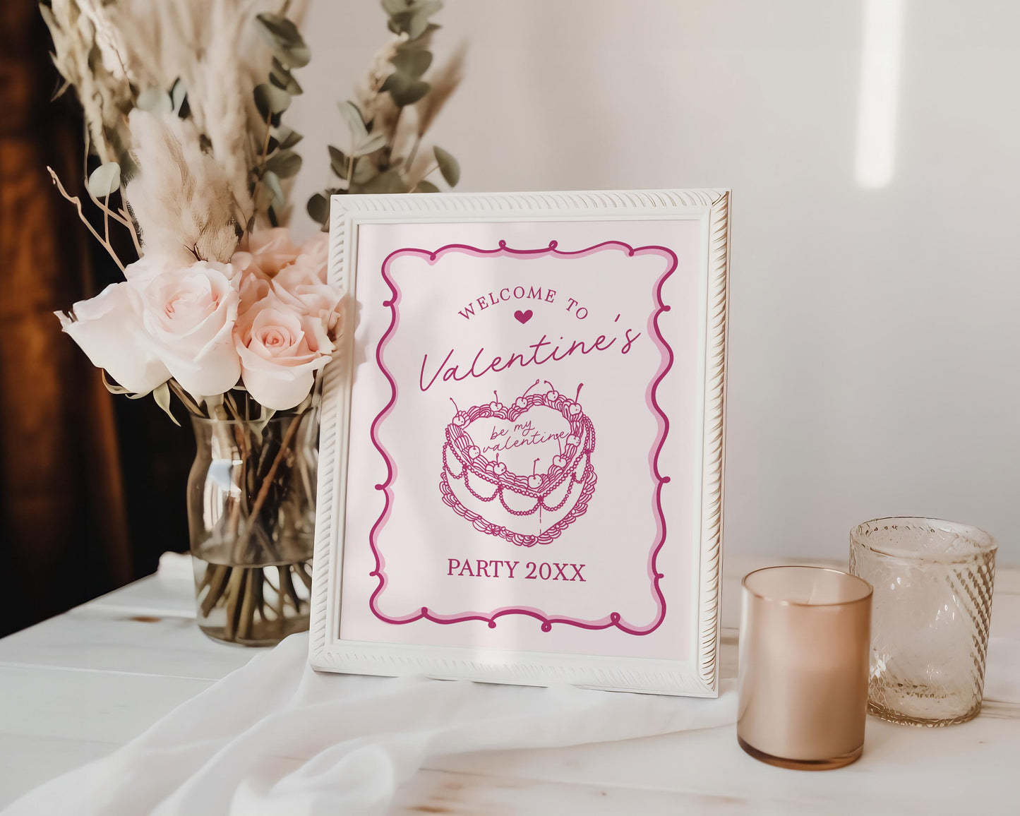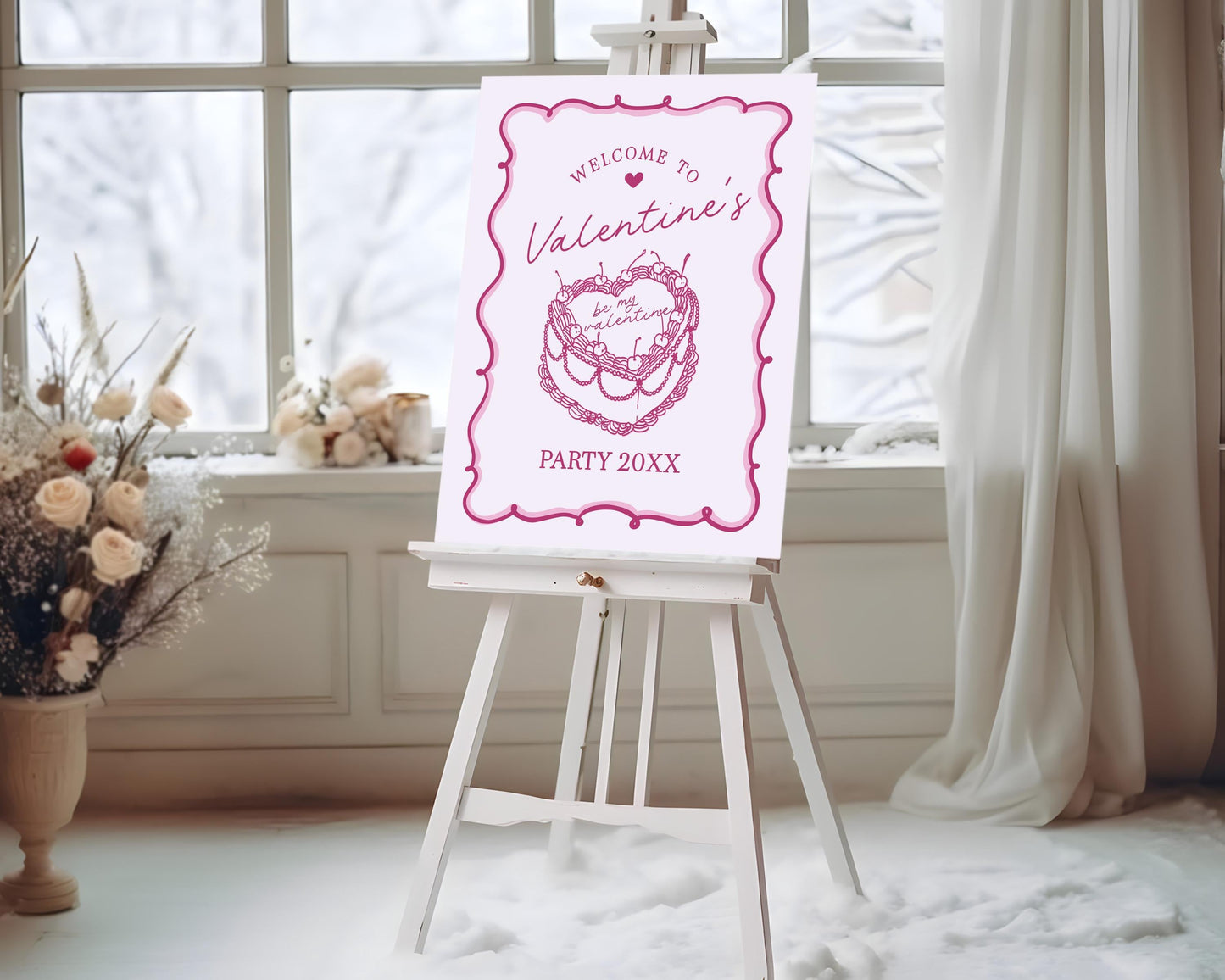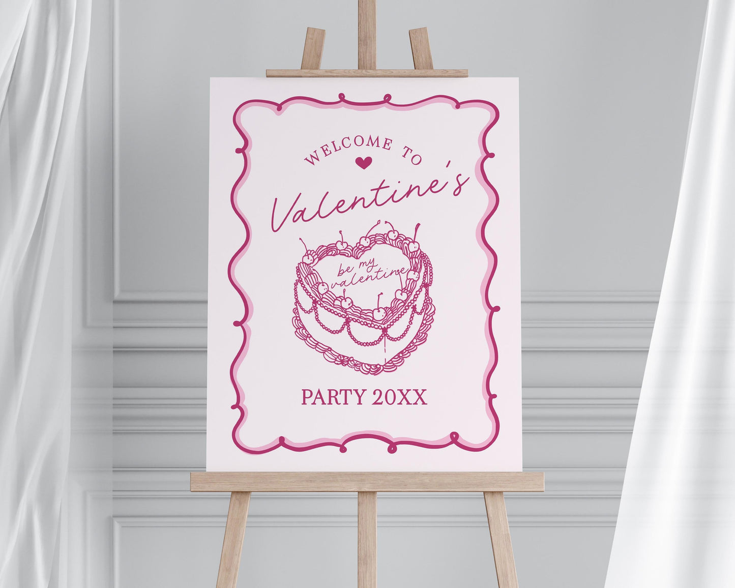 Pink Retro Coquette Heart Cake Valentines Party Welcome Sign Printable Template