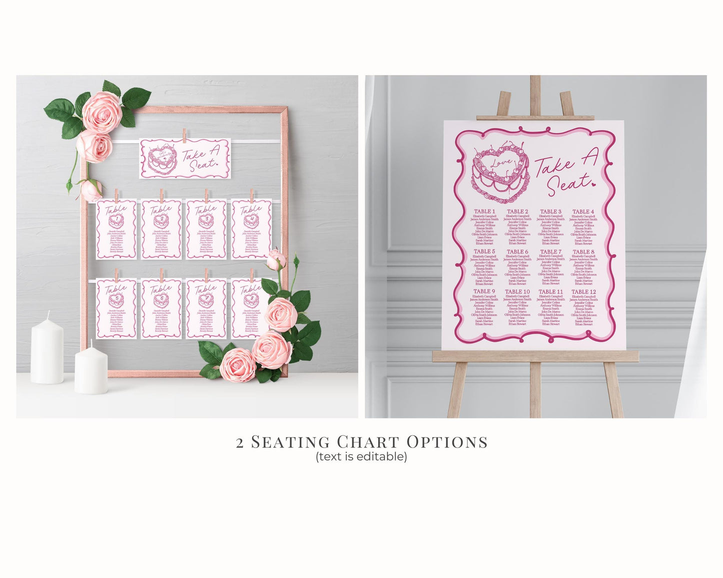 Pink Retro Heart Cake Seating Chart Printable Template, Vintage Bridal Shower Cherry Sweet February Theme Birthday Party Decor WP1008