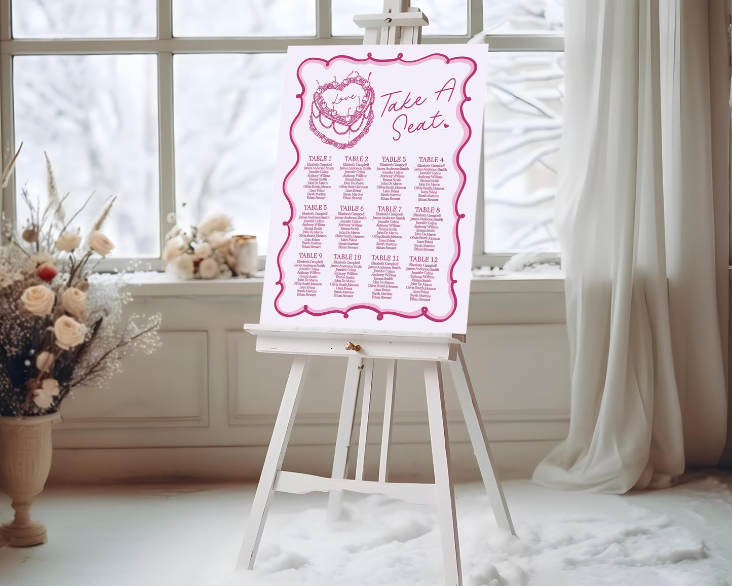 Pink Retro Heart Cake Seating Chart Printable Template