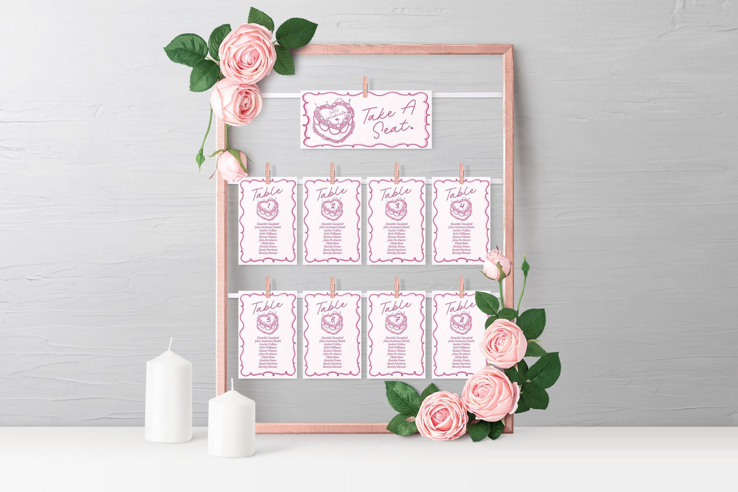 Pink Retro Heart Cake Seating Chart Cards Printable Template