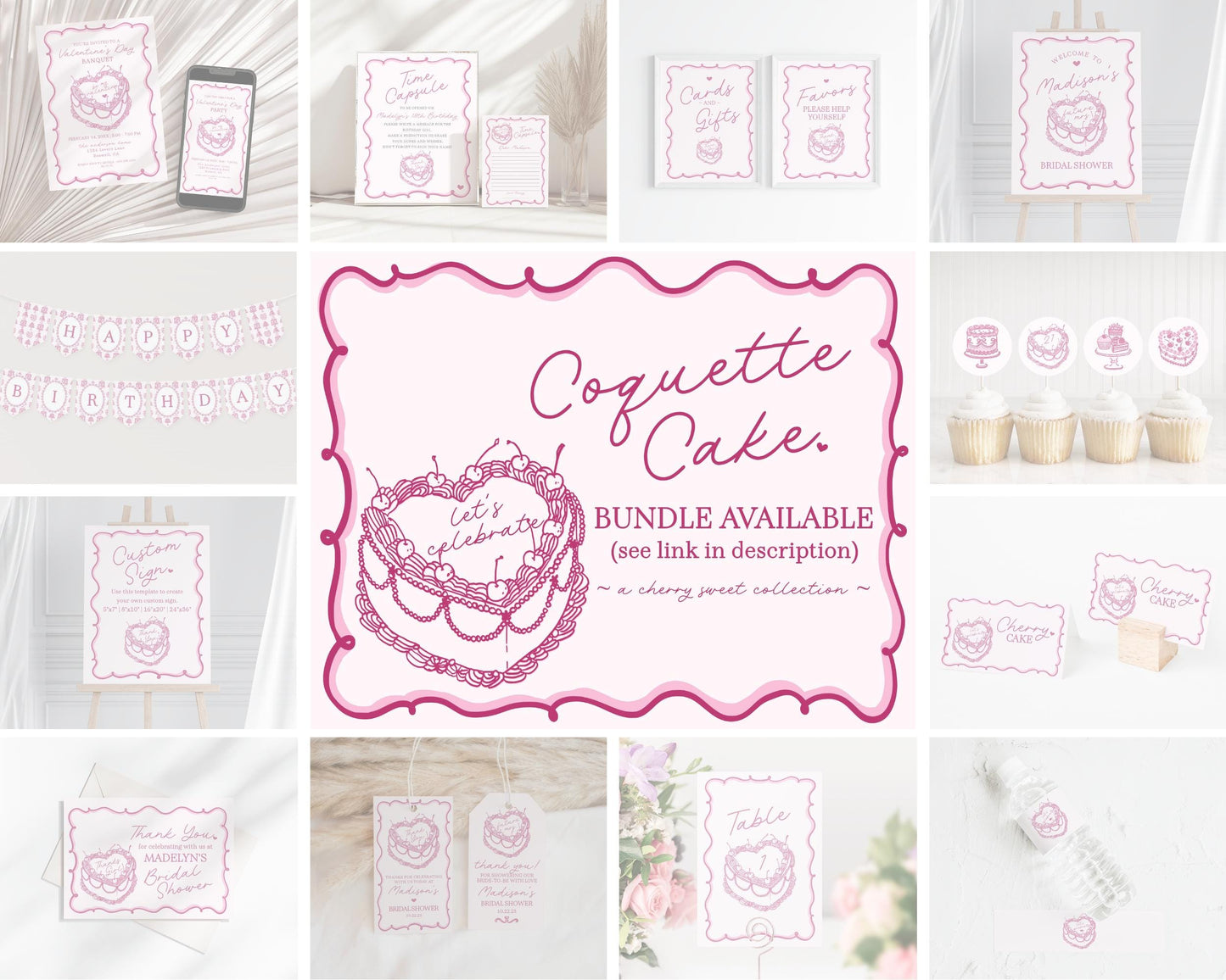 Pink Retro Coquette Heart Cake Galentines Party Bundle Printable Template