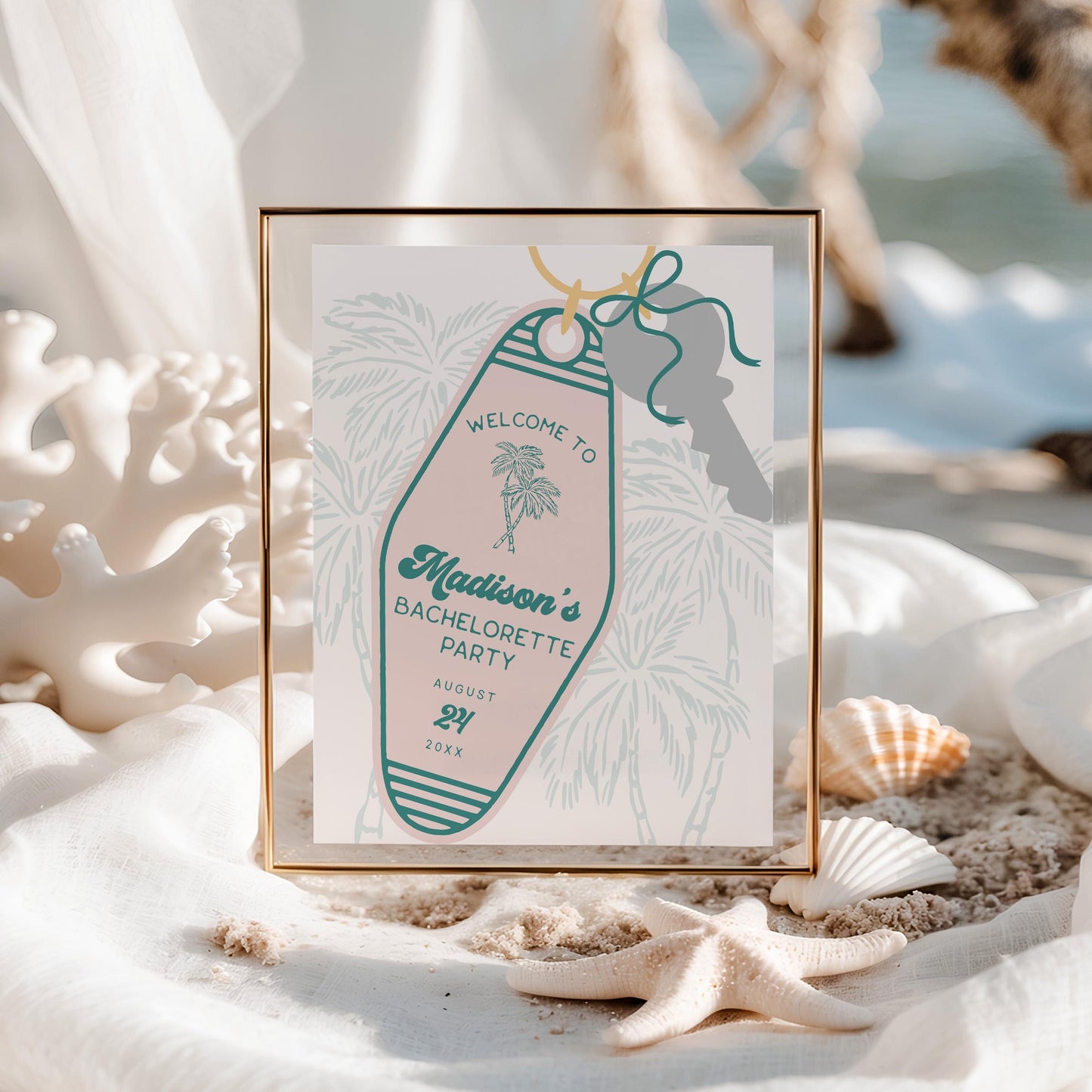 Meet me in the palms! This Retro Resort Beach Party Collection is a dreamy blend of vintage beach cabana charm and pastel perfection. Featuring a vintage motel keychain, breezy palm trees, and a touch of retro glam, this collection brings the magic of a sun-soaked getaway to your celebration. Whether you're hosting a bachelorette bash, bridal shower, or birthday soirée, these chic retro will transport your guests straight to a stylish mid-century oasis.