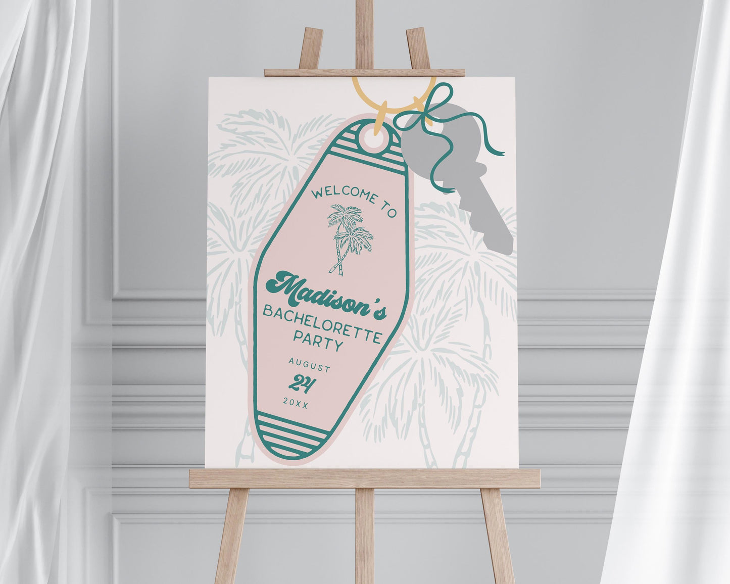 Pink Retro Resort Key Birthday Welcome Sign Template, Vintage Motel Keychain Beach Cabana Birthday Pool Party, Beach Club Party WP1059