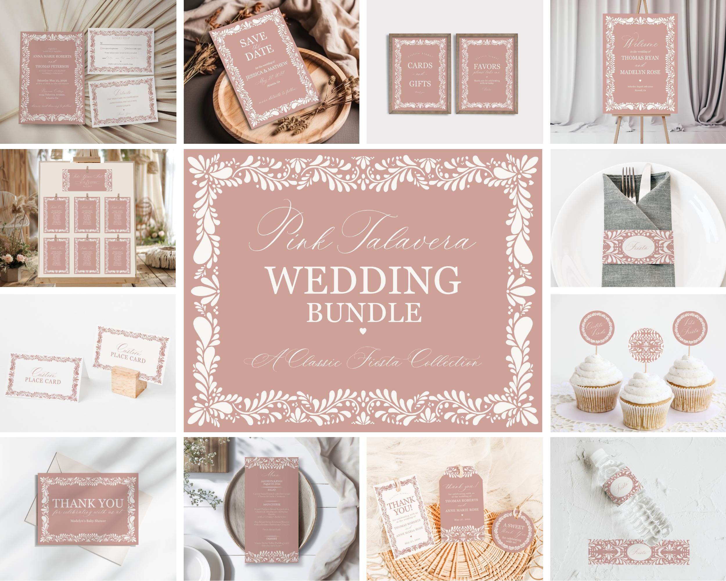 Pink Talavera Wedding Decor Printable Template Bundle, Spanish Mexican Wedding Fiesta, Rose Papel Picado Wedding Decor WP1017