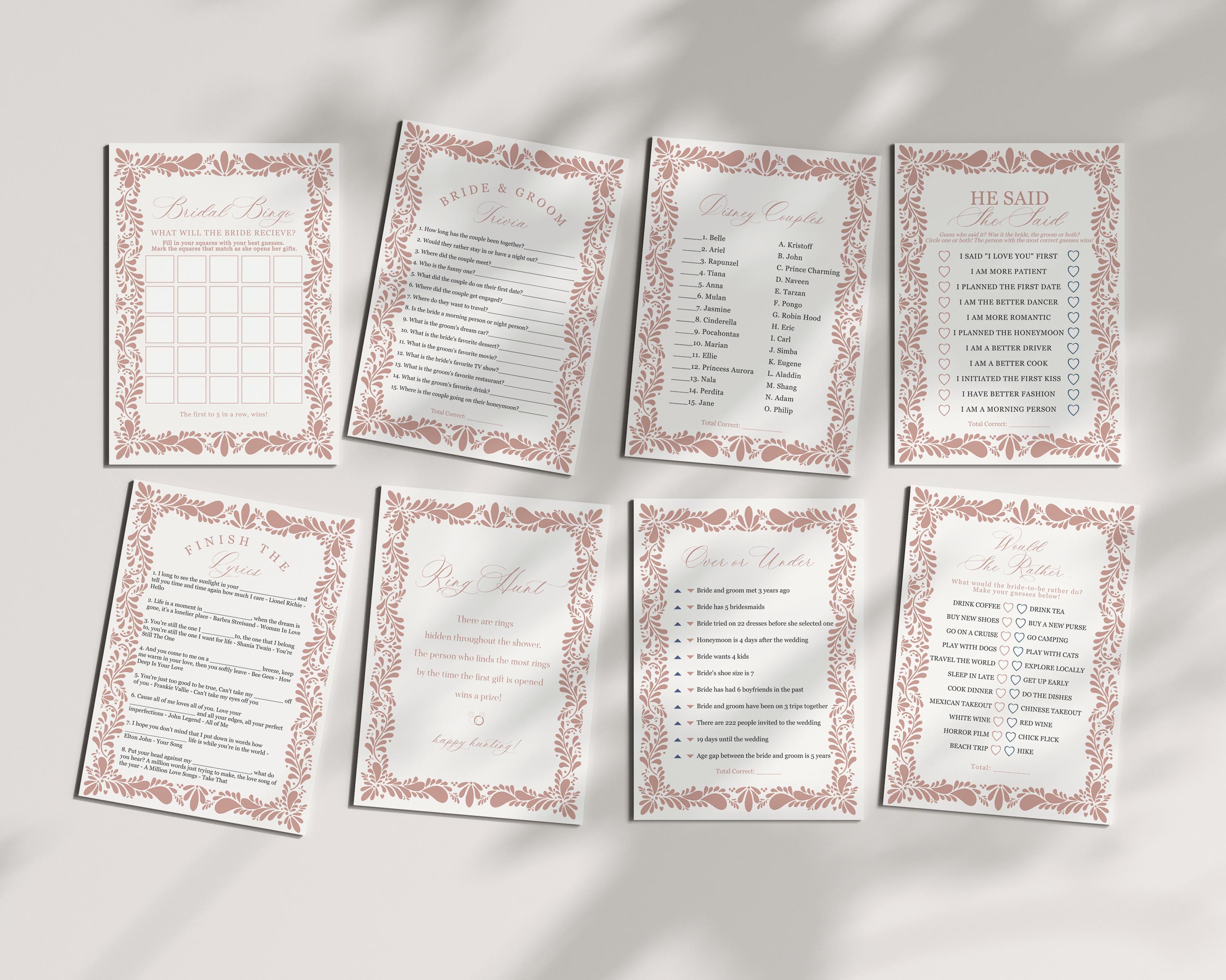 Pink Talavera Bridal Shower Games Set Printable Template, Spanish Tile Mexican Couples Shower Fiesta, Rose Papel Picado Bridal Brunch WP1017