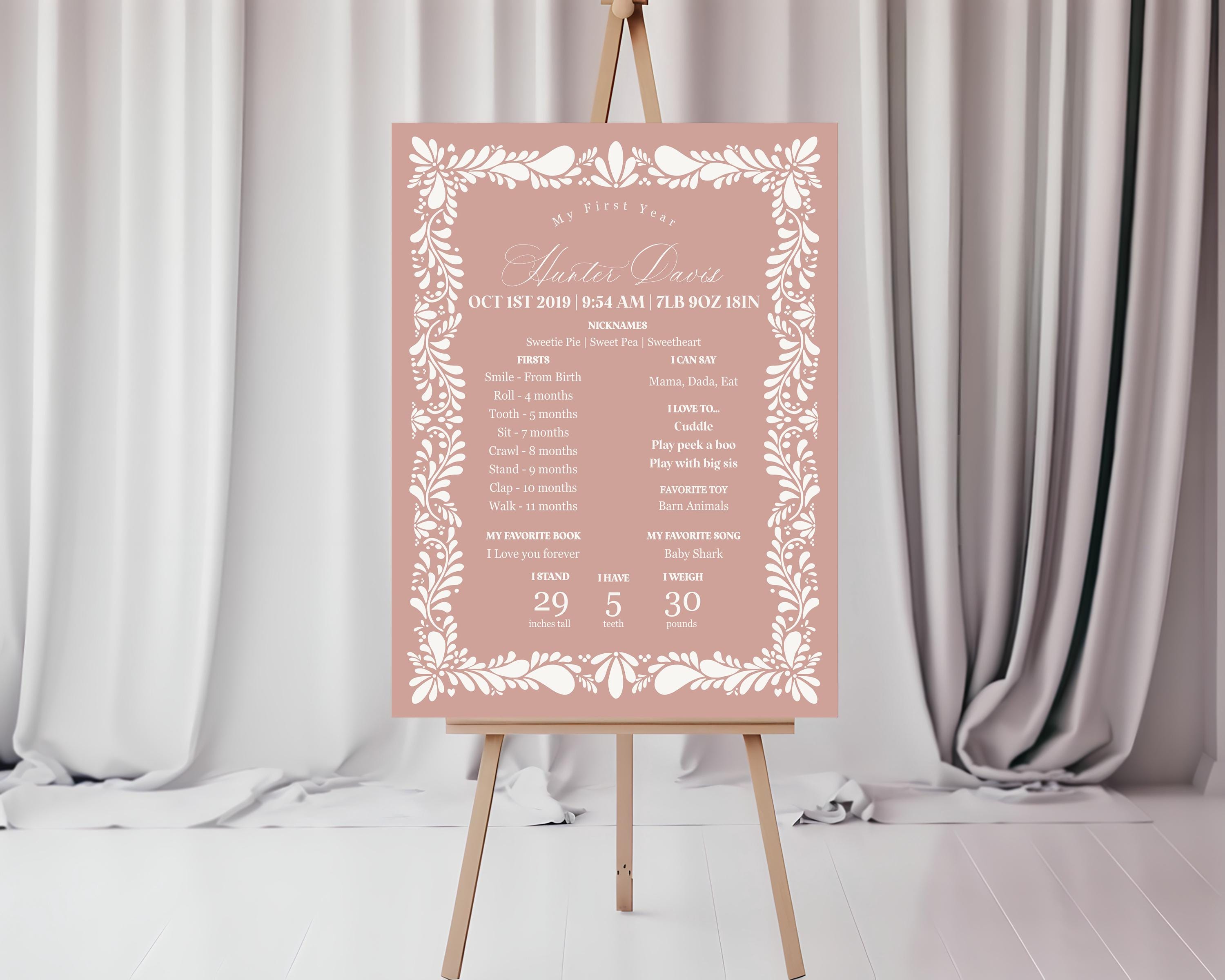 Pink Talavera First Year Milestone Sign Printable Template, Spanish Tile Mexican 1st Birthday Fiesta, Rose Papel Picado Party Decor WP1017