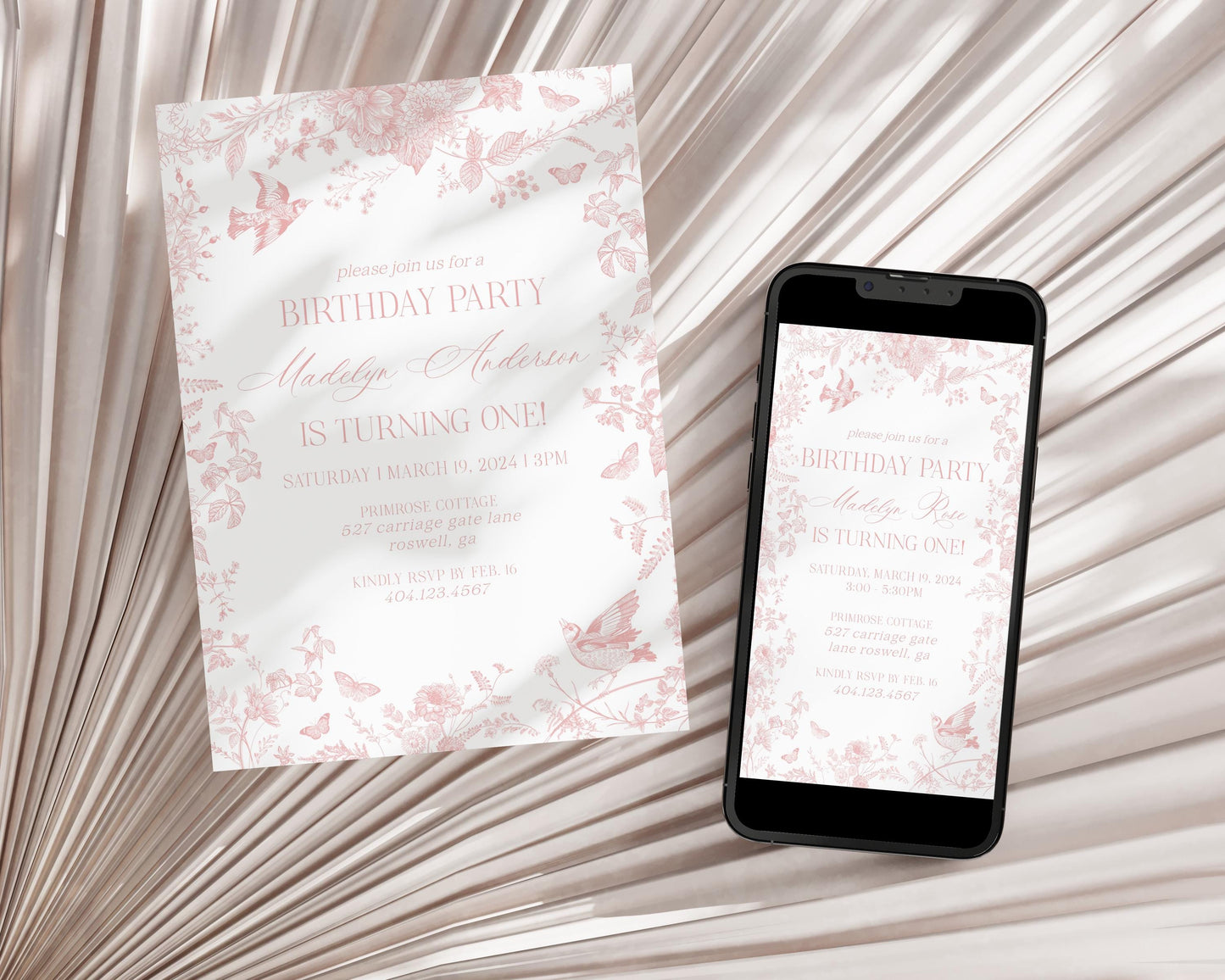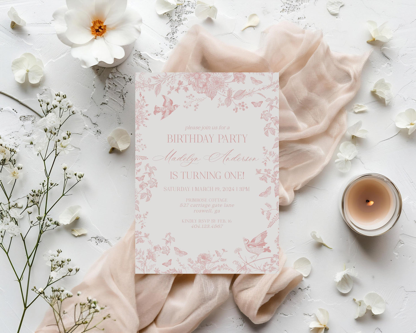 Pink Toile De Jouy First Birthday Bundle Printable Template, Pink Wildflower Chinoiserie 1st Birthday Party for Girl, French Floral WP1011