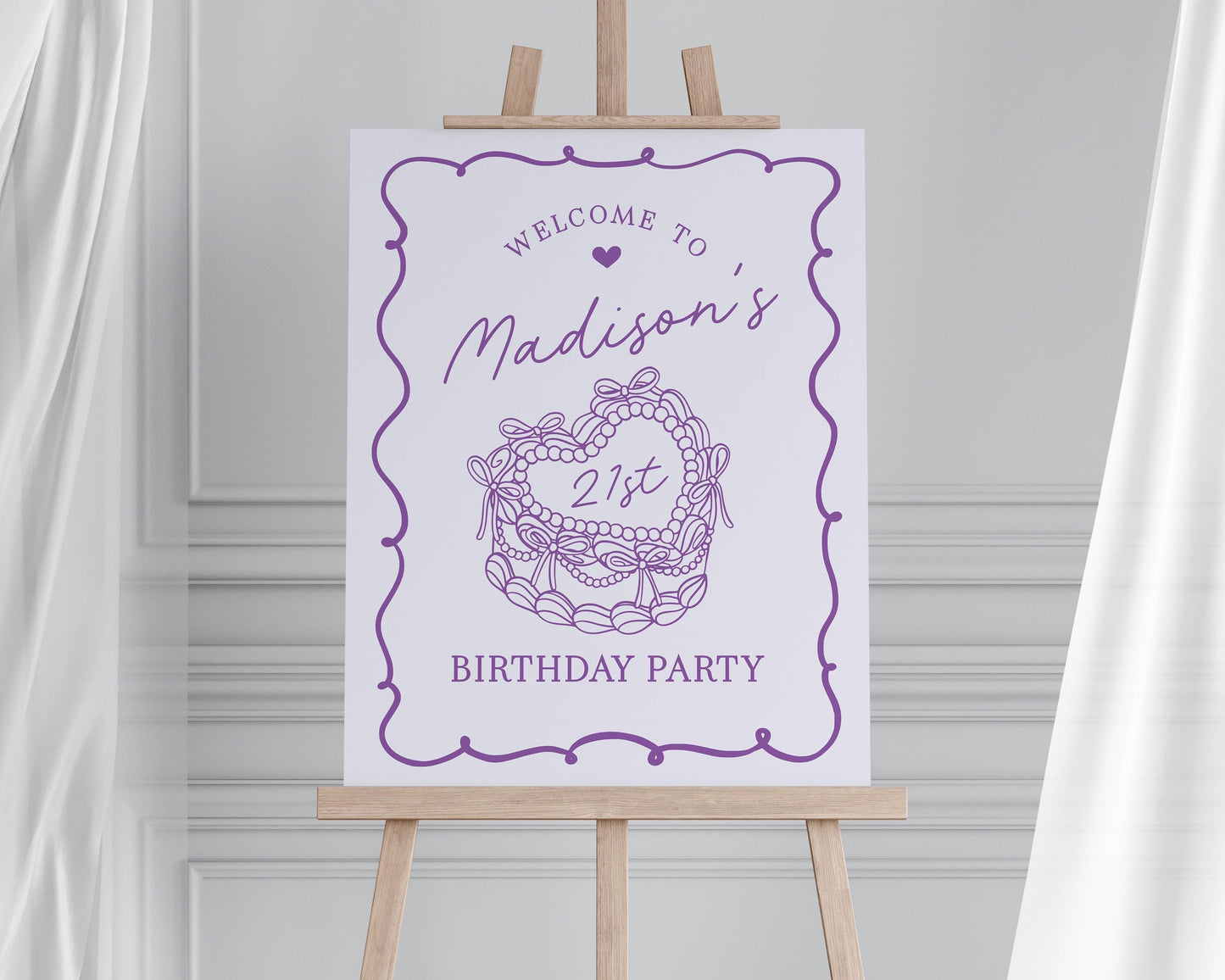 Purple Coquette Heart Cake Birthday Welcome Sign Printable Template
