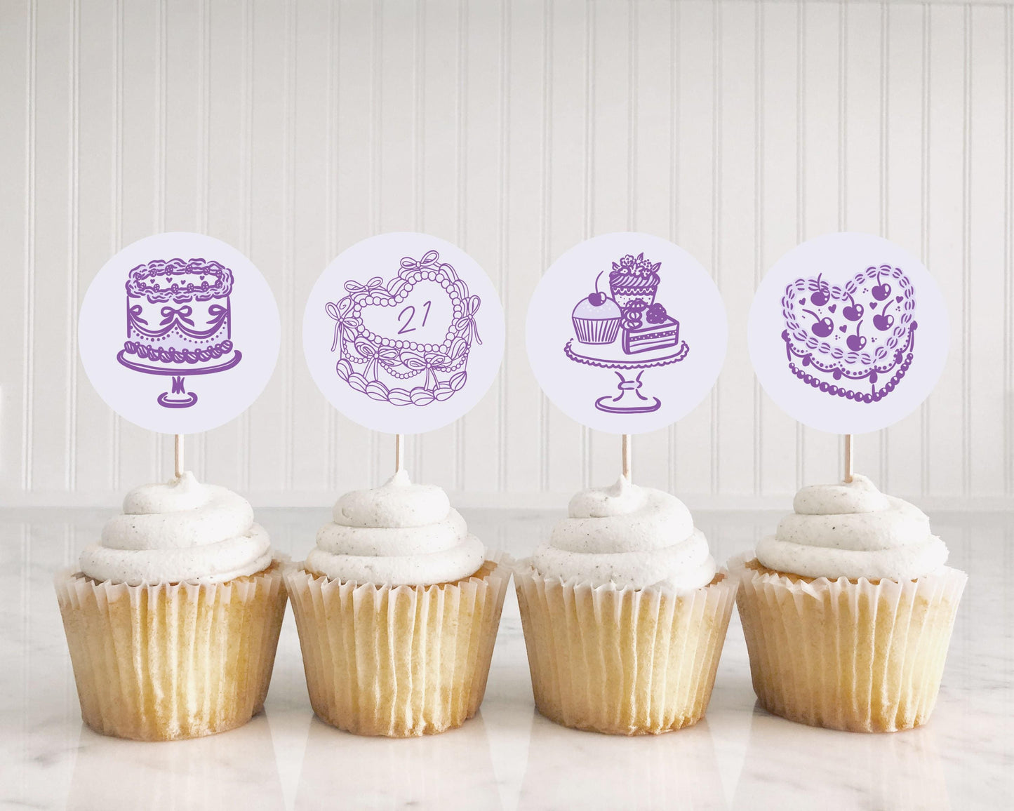 Purple Retro Coquette Heart Cake Bridal Shower Cupcake Toppers Template