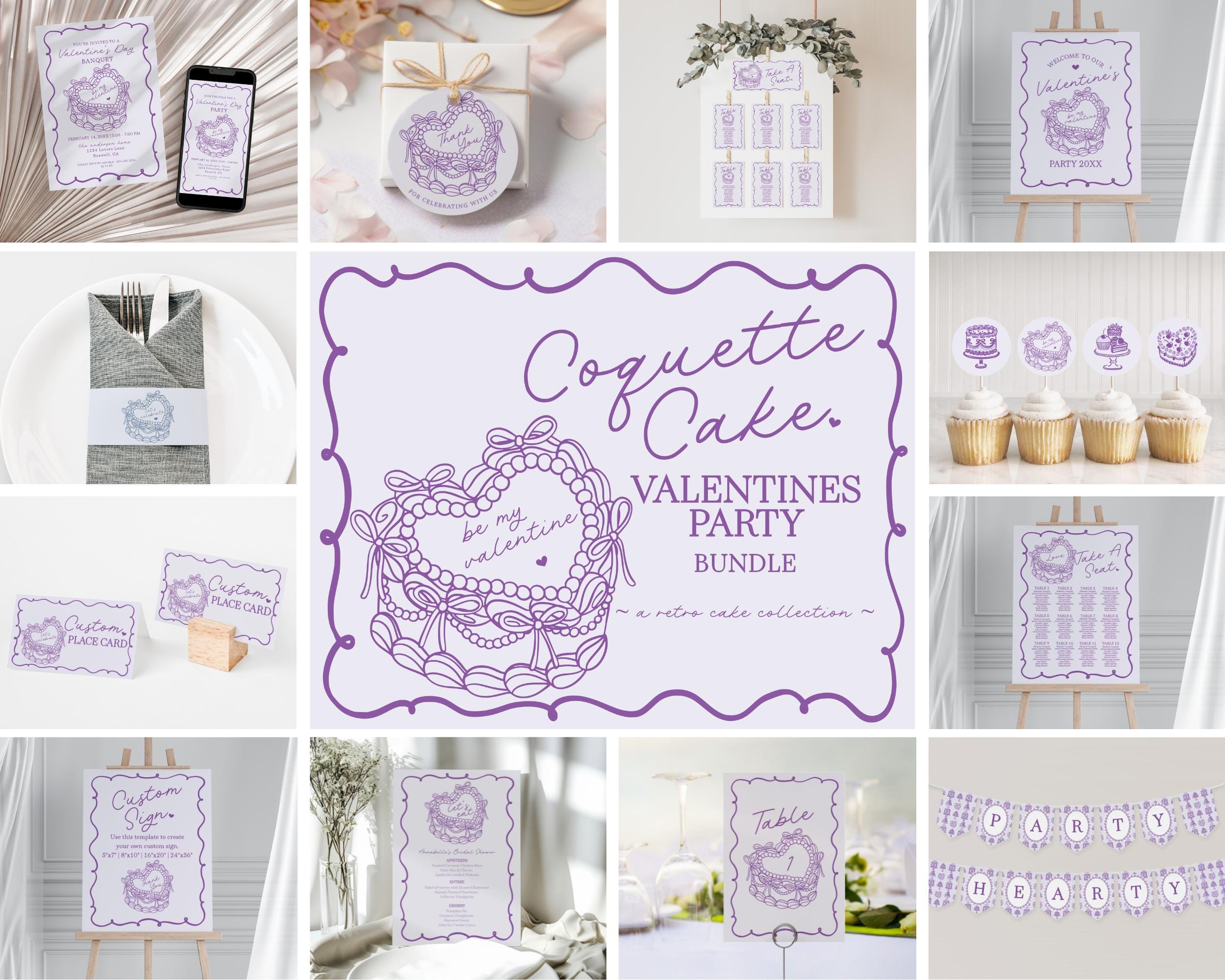 Purple Retro Coquette Heart Cake Valentines Party Bundle Template