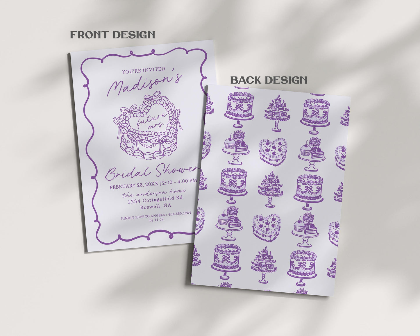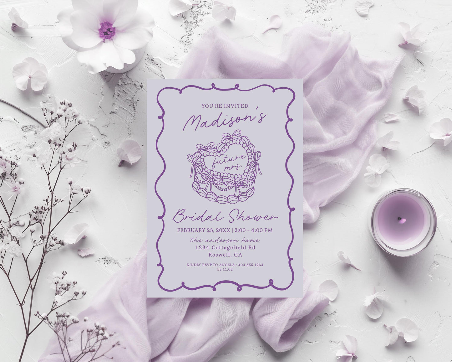 Purple Coquette Heart Cake Bridal Shower Invitation Template, Vintage Lavender Bow French Theme Retro Wedding Cake Bridal Brunch WP1035