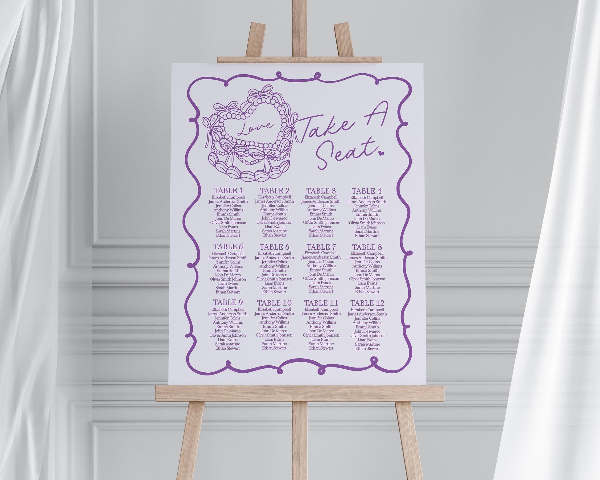 Purple Retro Heart Cake Seating Chart Printable Template, Birthday Lavender Bow Sweet February Valentines Bridal Shower Party Decor WP1035