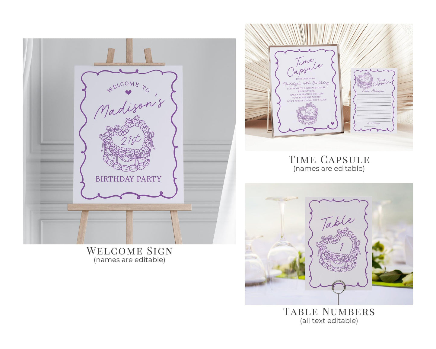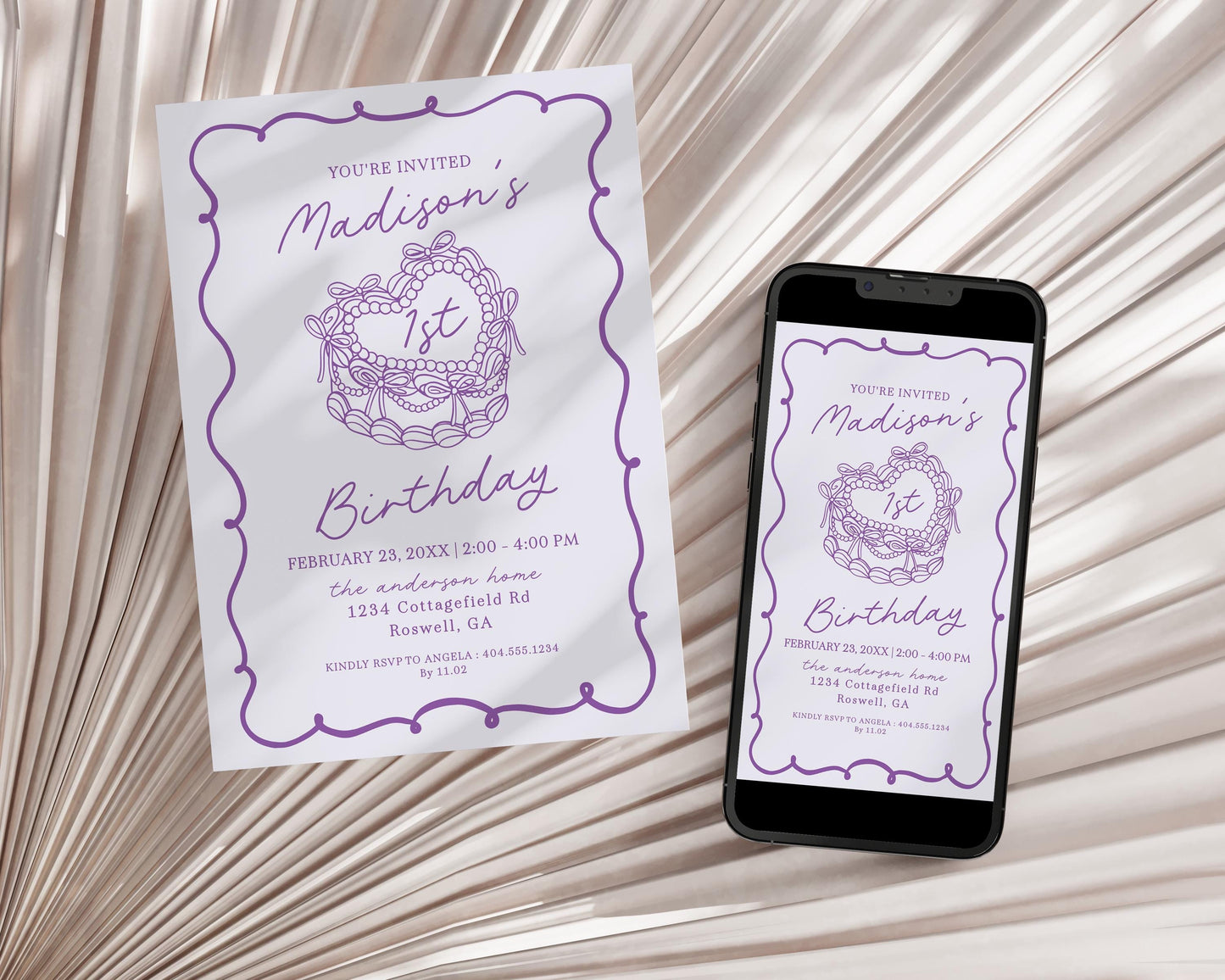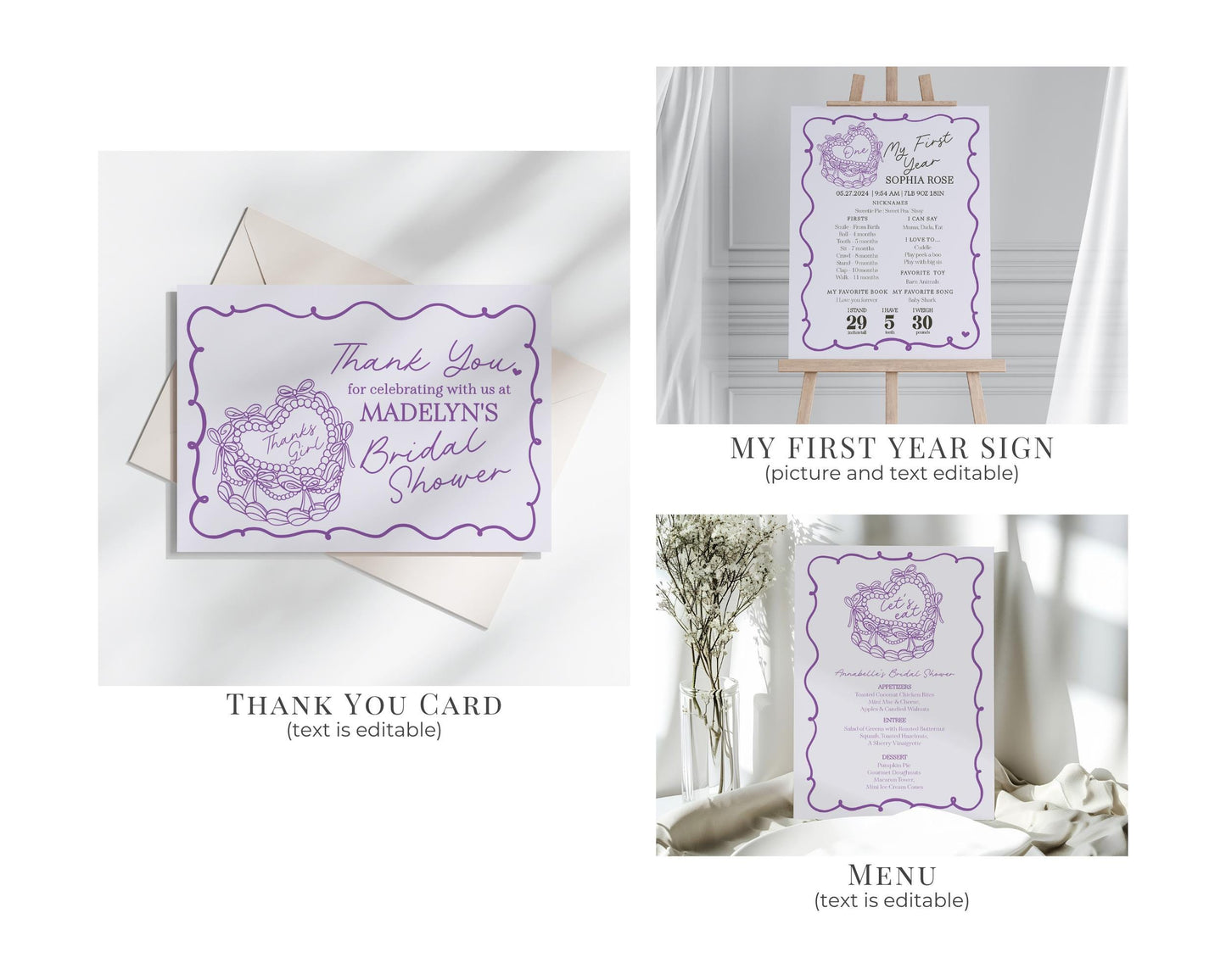 Purple Retro Heart Coquette Cake First Birthday Bundle Printable Template