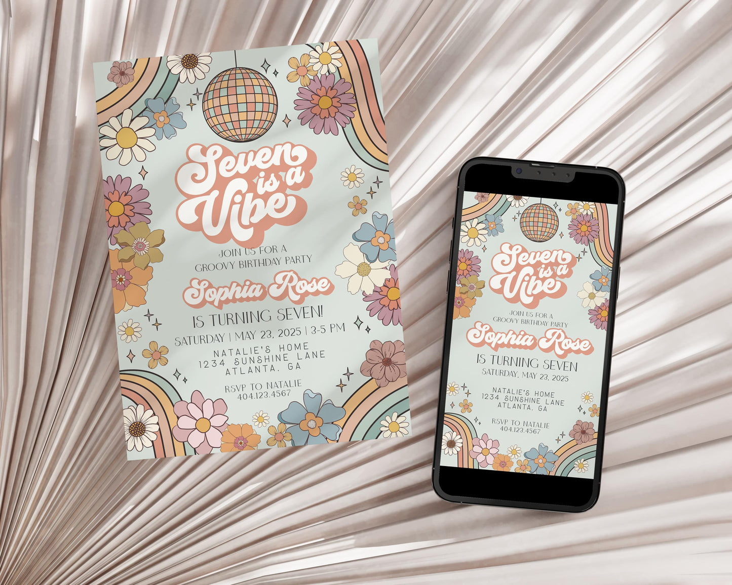 Seven is a Vibe Groovy Floral 7th Birthday Invitation Template