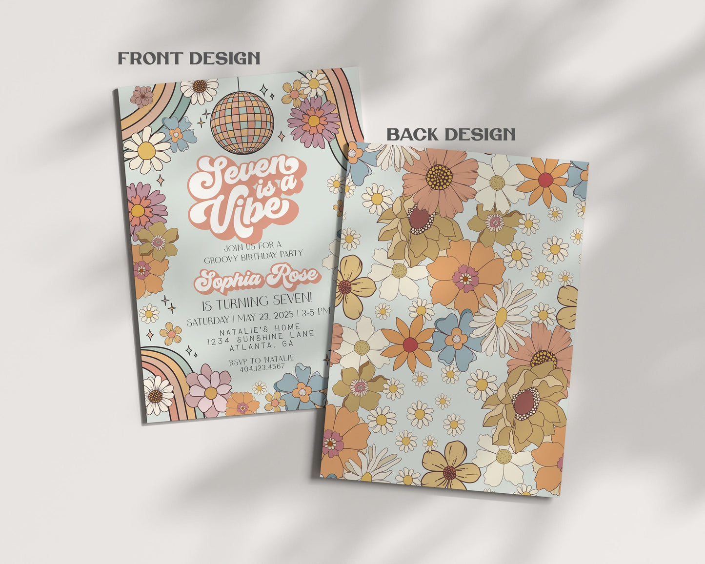 Seven is a Vibe! Celebrate your little girl's 7th birthday in style with this retro, 70s printable party collection! This fun and funky design features groovy florals and a vibrant color palette inspired by the iconic decade of peace, love, and happiness.