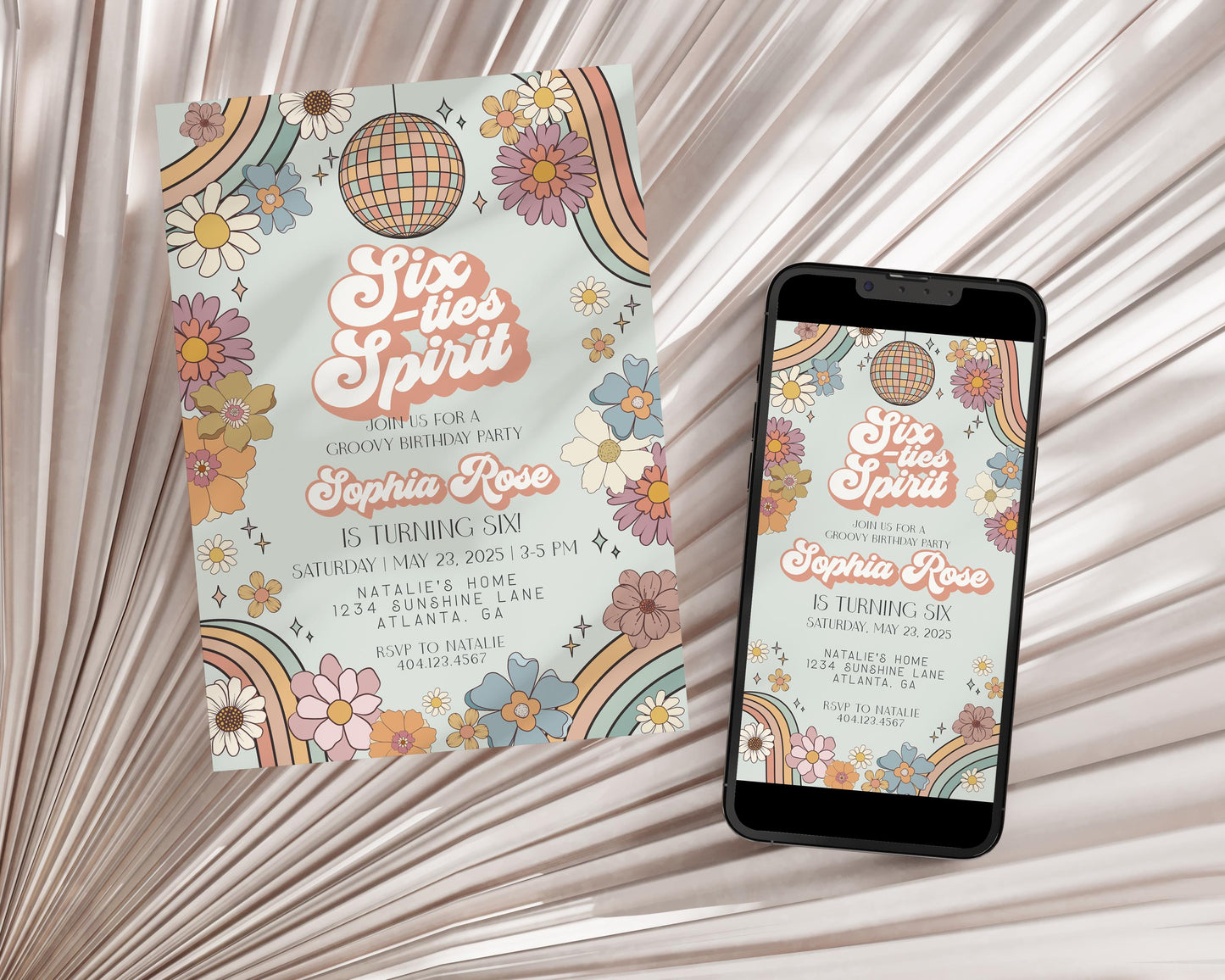 Six-ties Spirit Groovy Floral Sixth Birthday Party Bundle Template