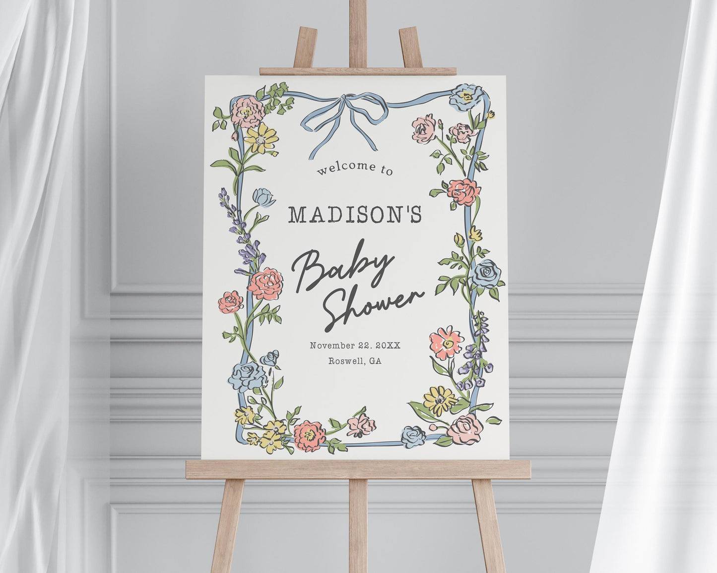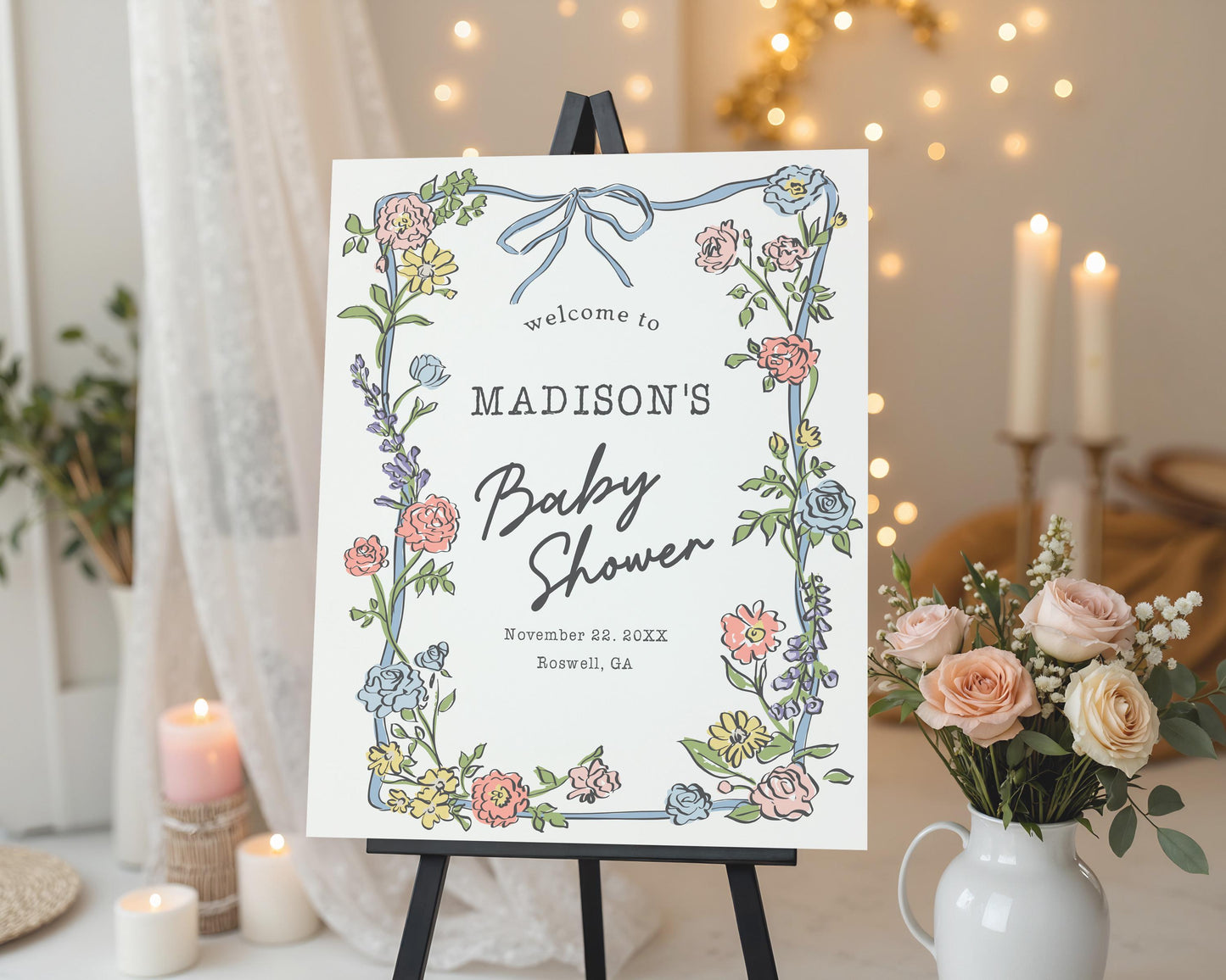 Spring Garden Party Baby Shower Welcome Sign Template, Pastel Floral Baby in Bloom Baby Sprinkle, Coquette Summer Wildflower Bouquet WP1057