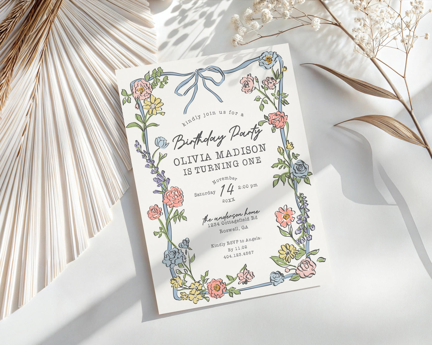 Your little wildflower is having a birthday! Celebrate your birthday girl with this pastel bouquet of hand-drawn florals. This fresh floral theme is inspired by the charm of a French Flower Market, featuring fanciful wildflower doodles with a delicate blue coquette bow.