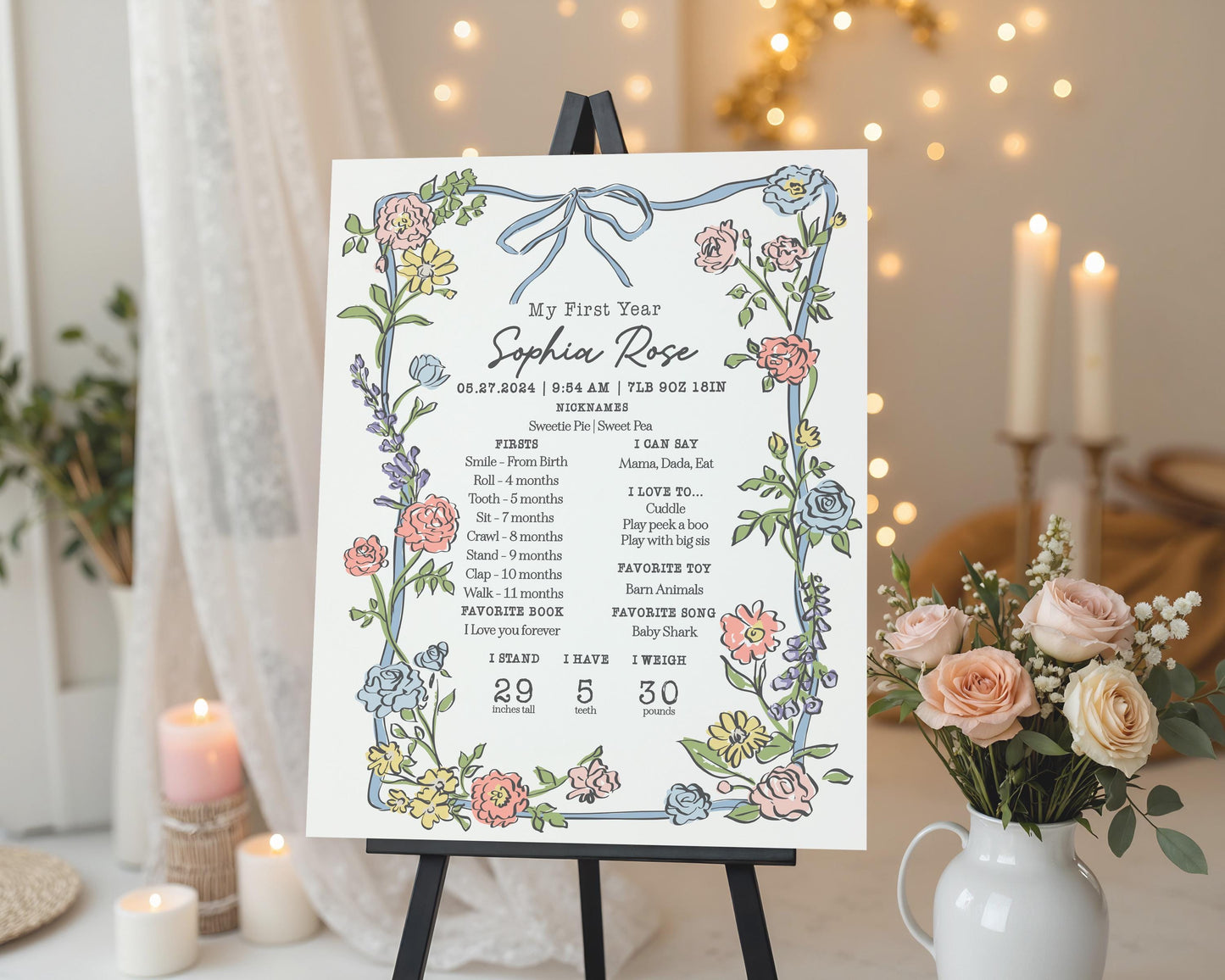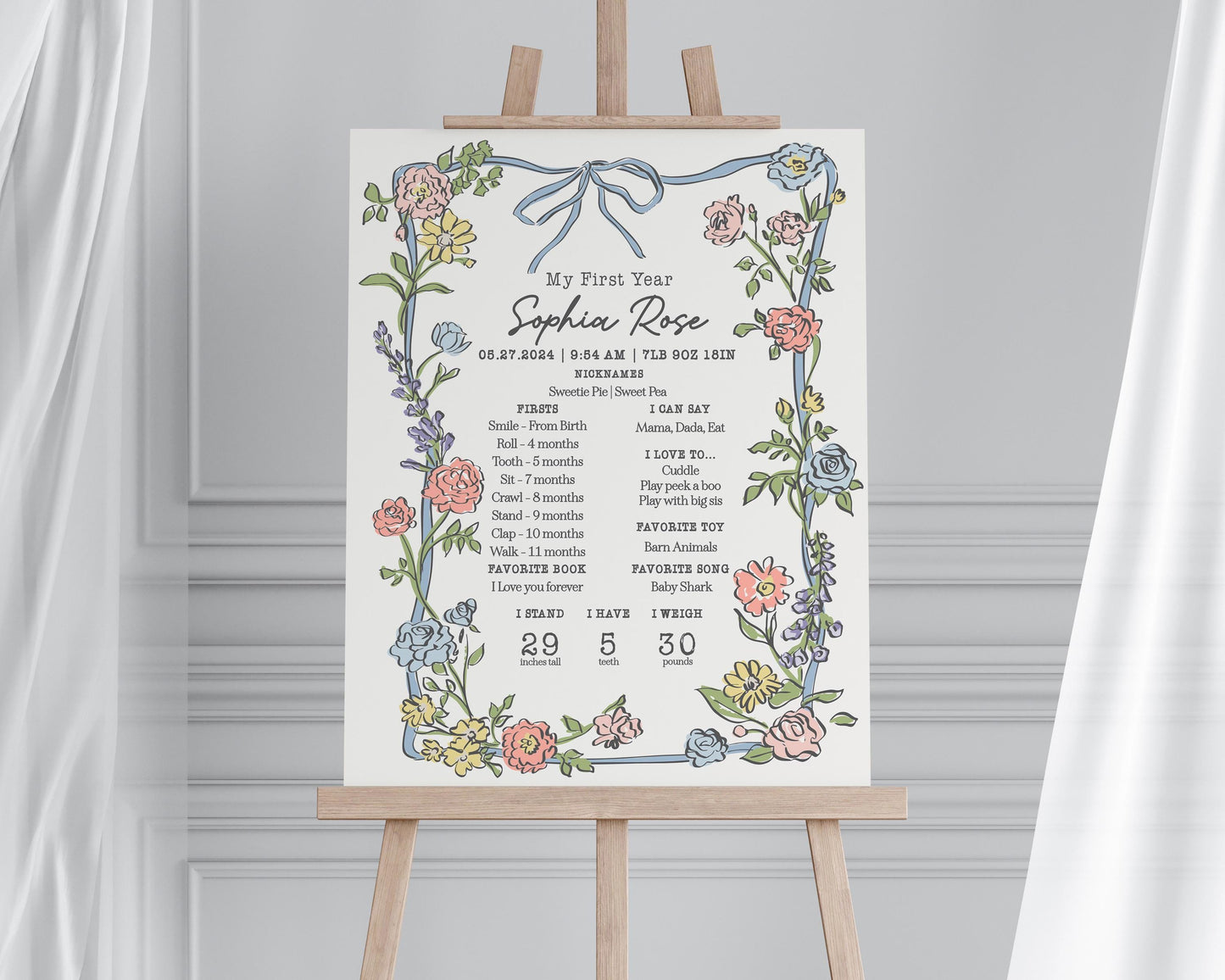 Spring Garden Party My First Year Milestone Sign Template, Pastel Floral 1st Birthday Party Coquette Summer Little Wildflower Bouquet WP1057
