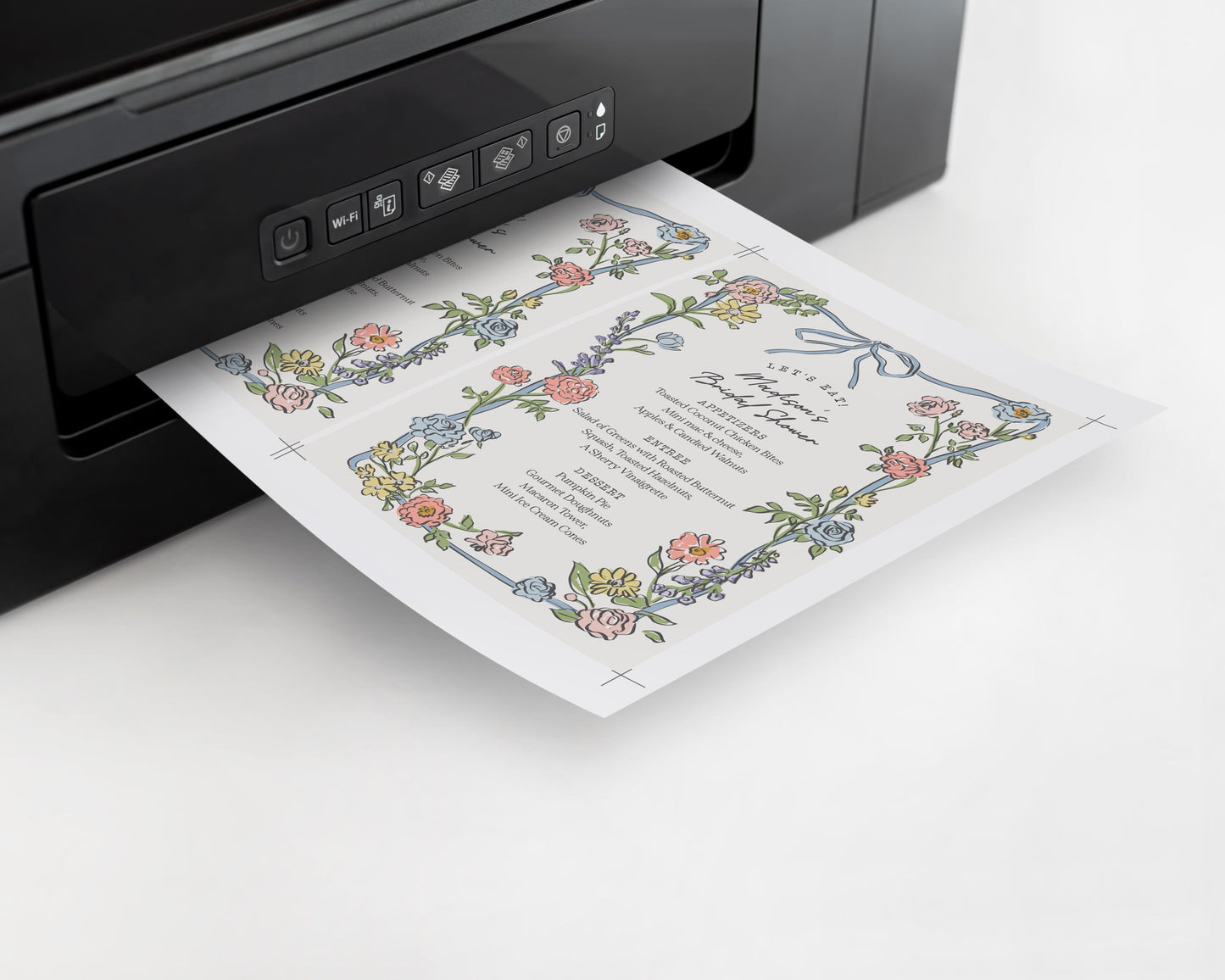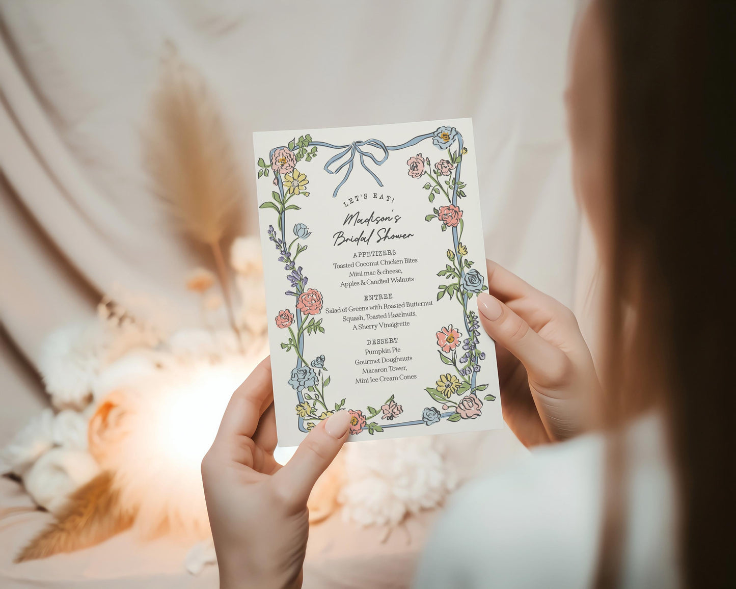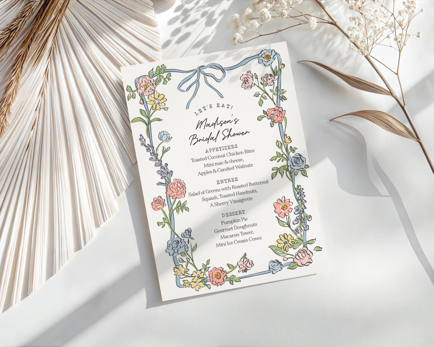 Spring Garden Party Printable Wedding Menu Template, Pastel Floral Baby Shower, Wildflower Bridal Shower for Summer Bouquet Wedding WP1057