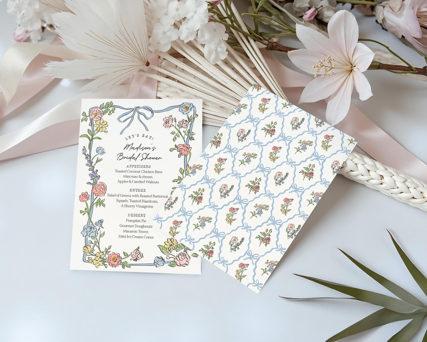 Celebrate with this pastel bouquet of hand-drawn florals. This fresh floral theme is inspired by the charm of a French Flower Market, featuring fanciful wildflower doodles with a delicate blue coquette bow.