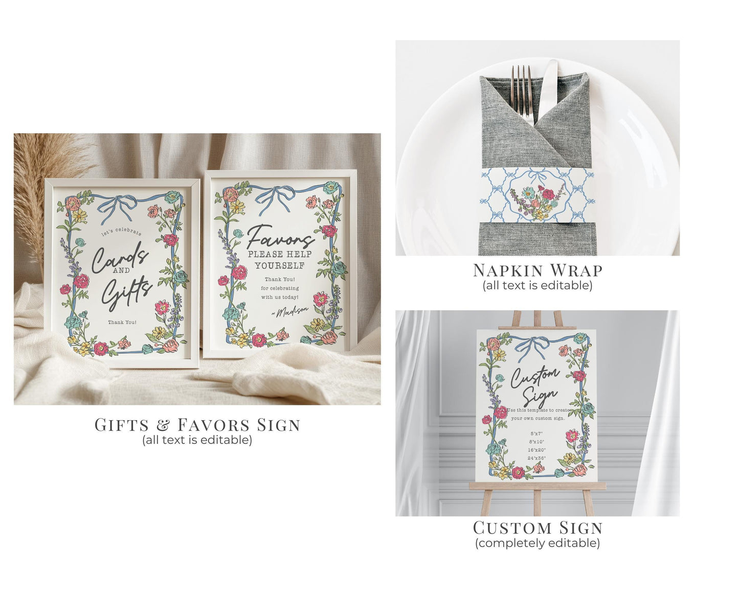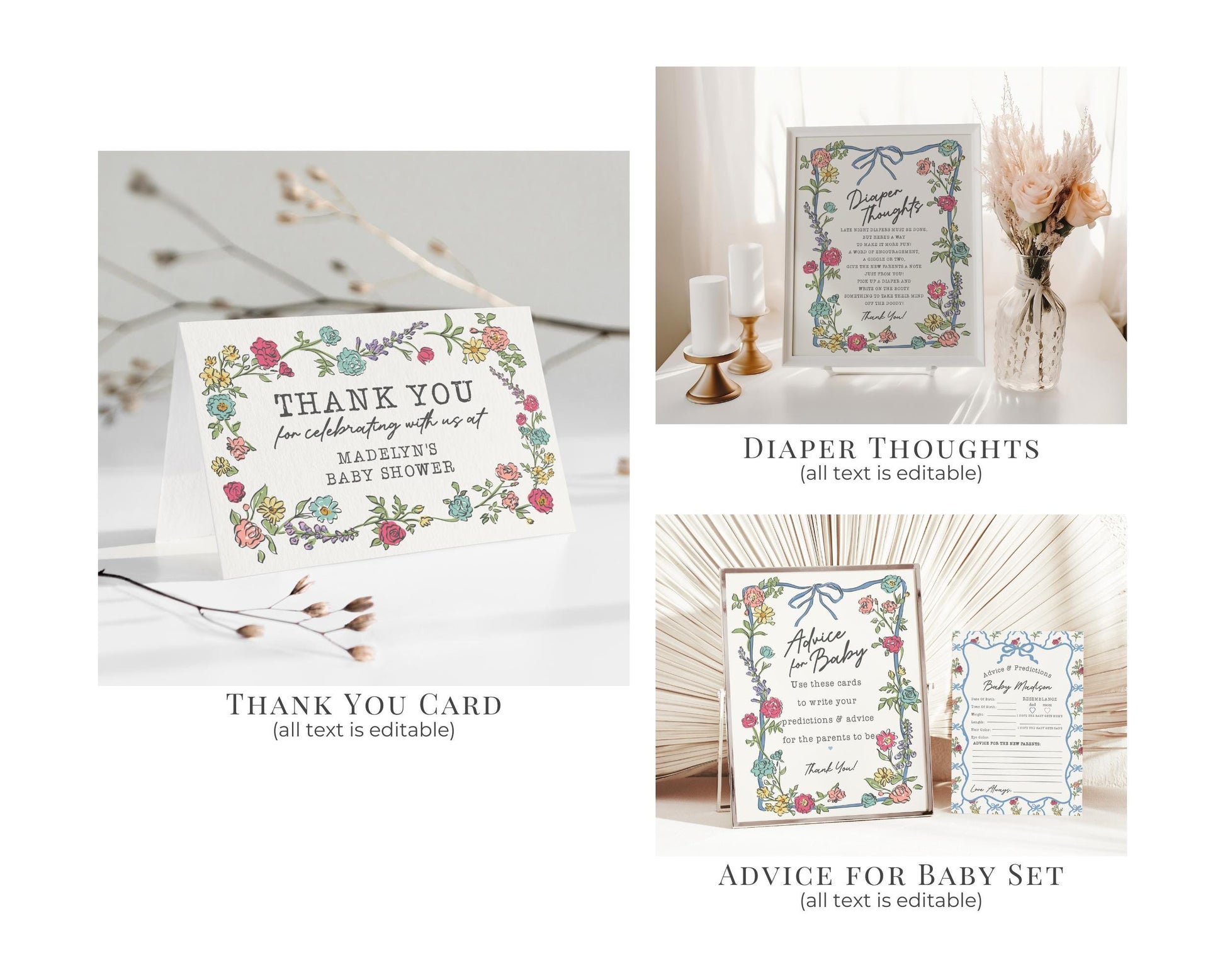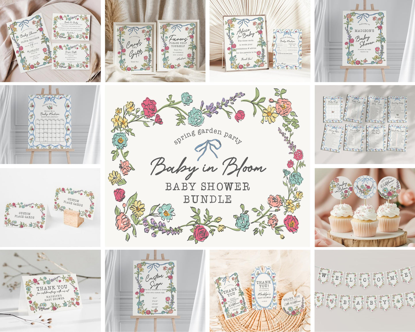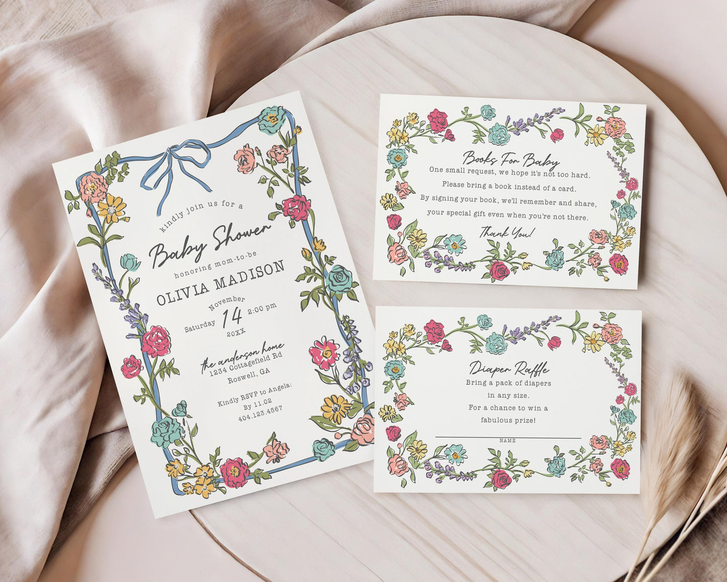 There is a Baby in Bloom! Celebrate your mom-to-be with this bright bouquet of hand-drawn florals. This fresh floral theme is inspired by the charm of a French Flower Market, featuring fanciful wildflower doodles with a delicate blue coquette bow.