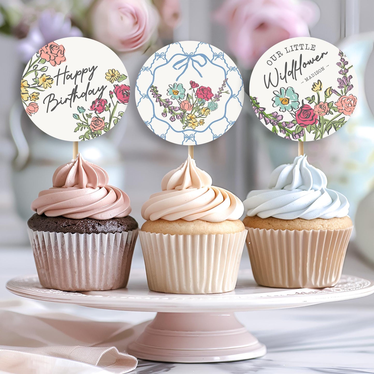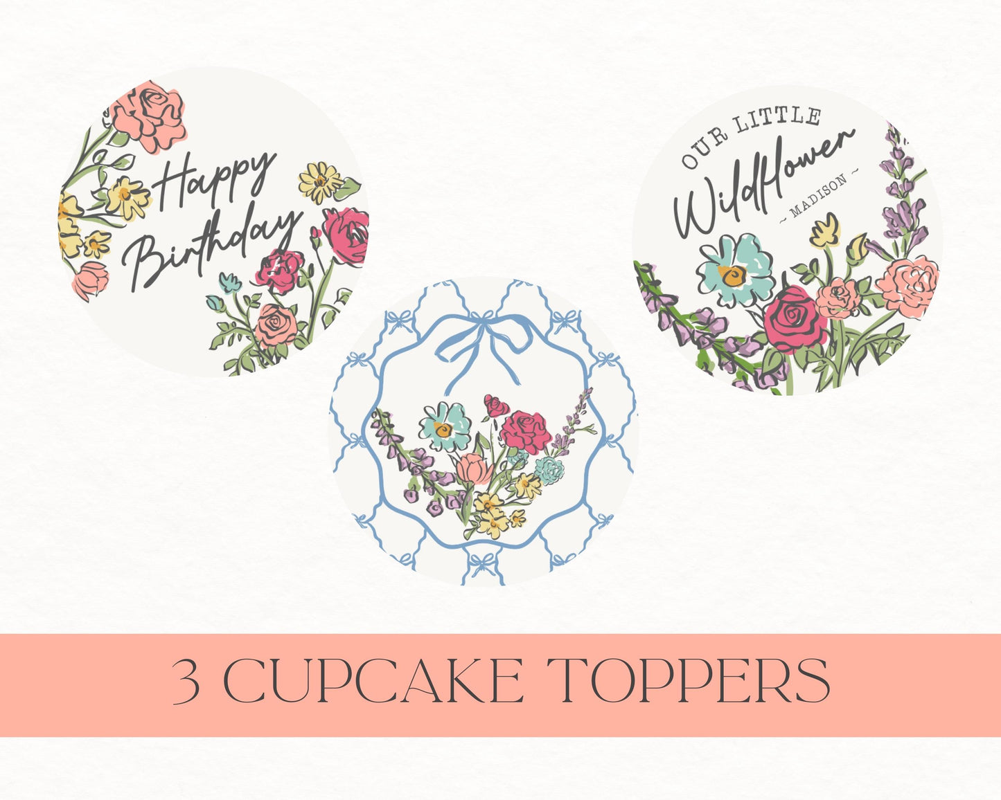 Summer Garden Party Birthday Cupcake Topper Template, Bright Floral Birthday Party, Coquette Summer Little Wildflower Bouquet Doodle WP1058