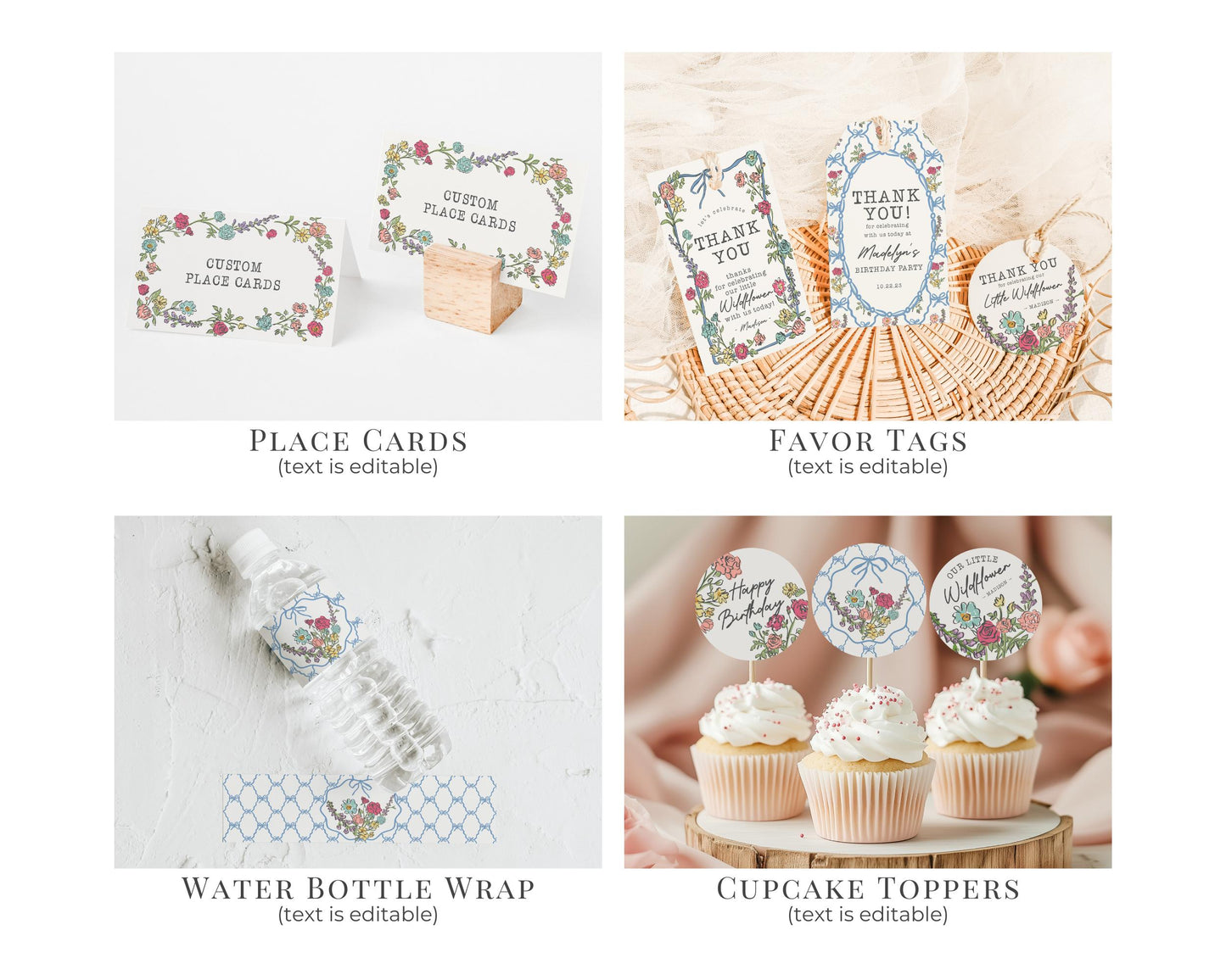 Your little wildflower is having a birthday! Celebrate your birthday girl with this bright bouquet of hand-drawn florals. This fresh floral theme is inspired by the charm of a French Flower Market, featuring fanciful wildflower doodles with a delicate blue coquette bow.