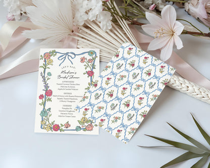 Celebrate with this bright bouquet of hand-drawn florals. This fresh floral theme is inspired by the charm of a French Flower Market, featuring fanciful wildflower doodles with a delicate blue coquette bow.