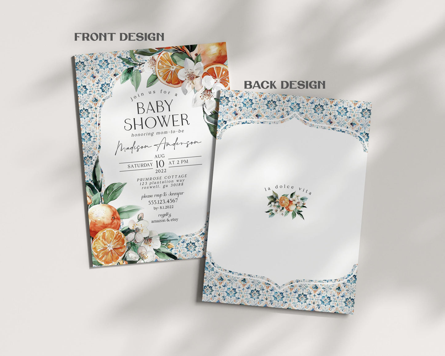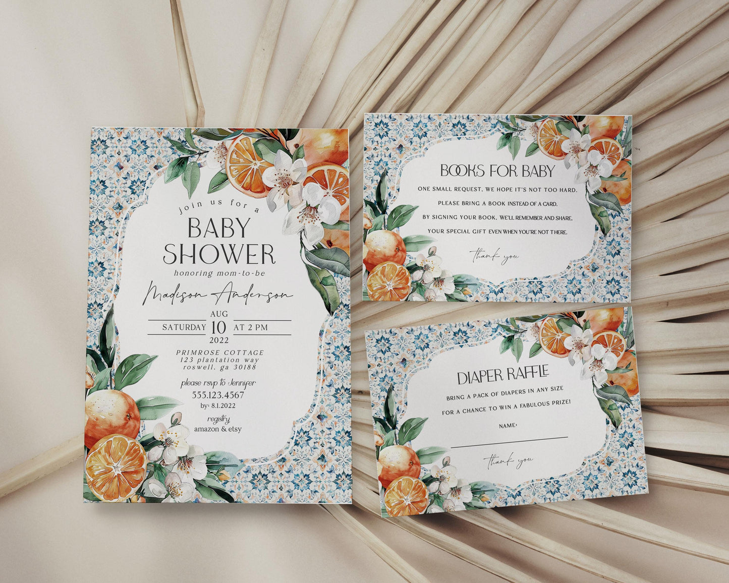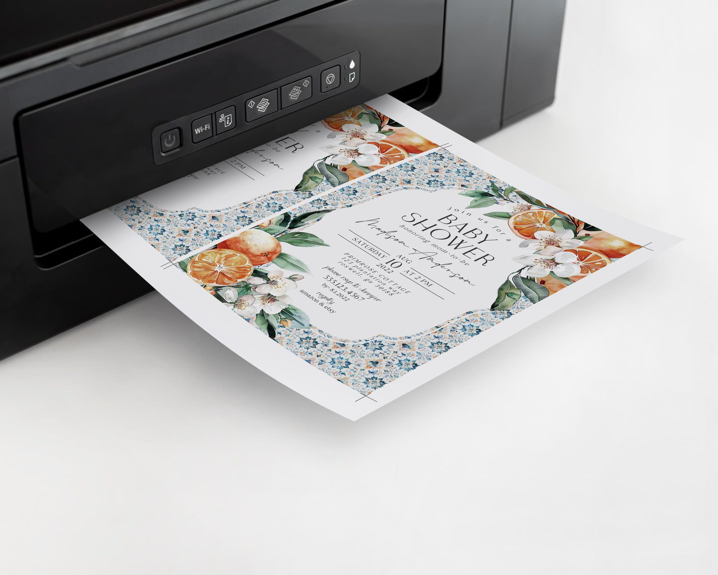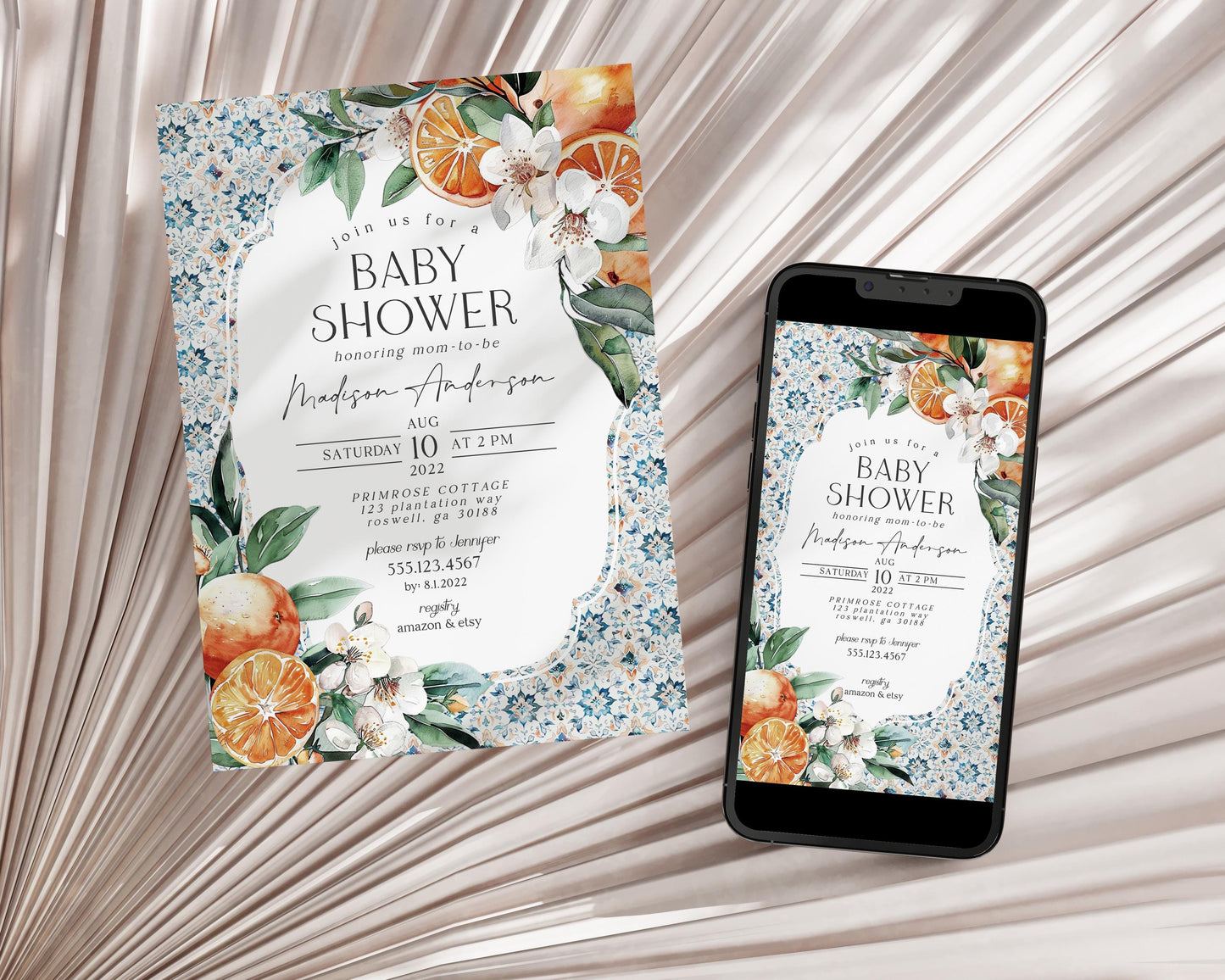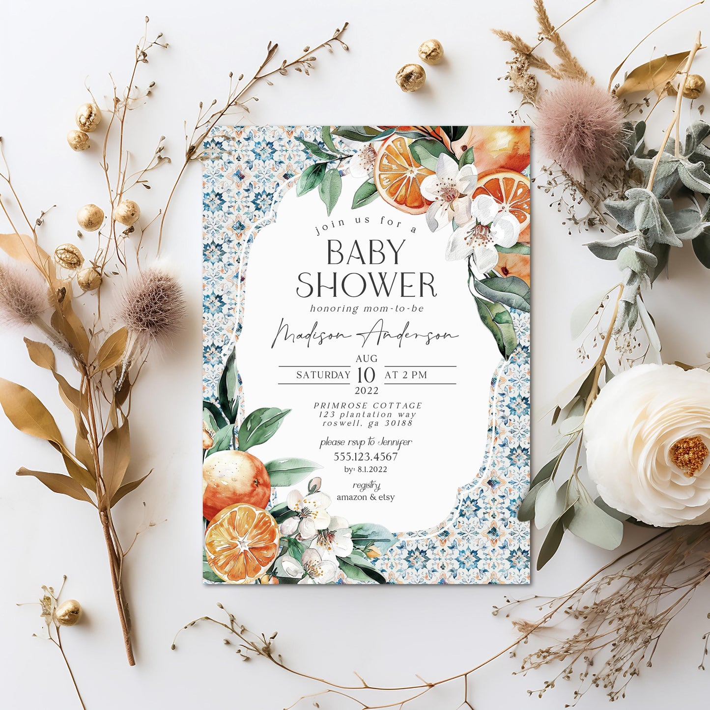 Tuscany Tile Baby Shower Invitation Printable Template, Orange Citrus Mediterranean baby sprinkle with Spanish tiles, Italian theme beach