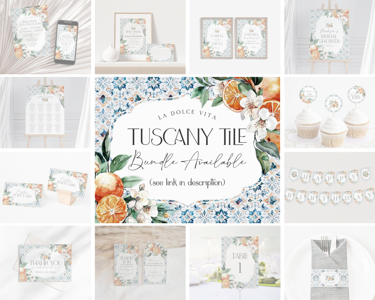 Tuscany Tile Baby Shower Printable Bundle, Orange Citrus Mediterranean baby sprinkle with Spanish tiles, Italian theme Pasitino beach party