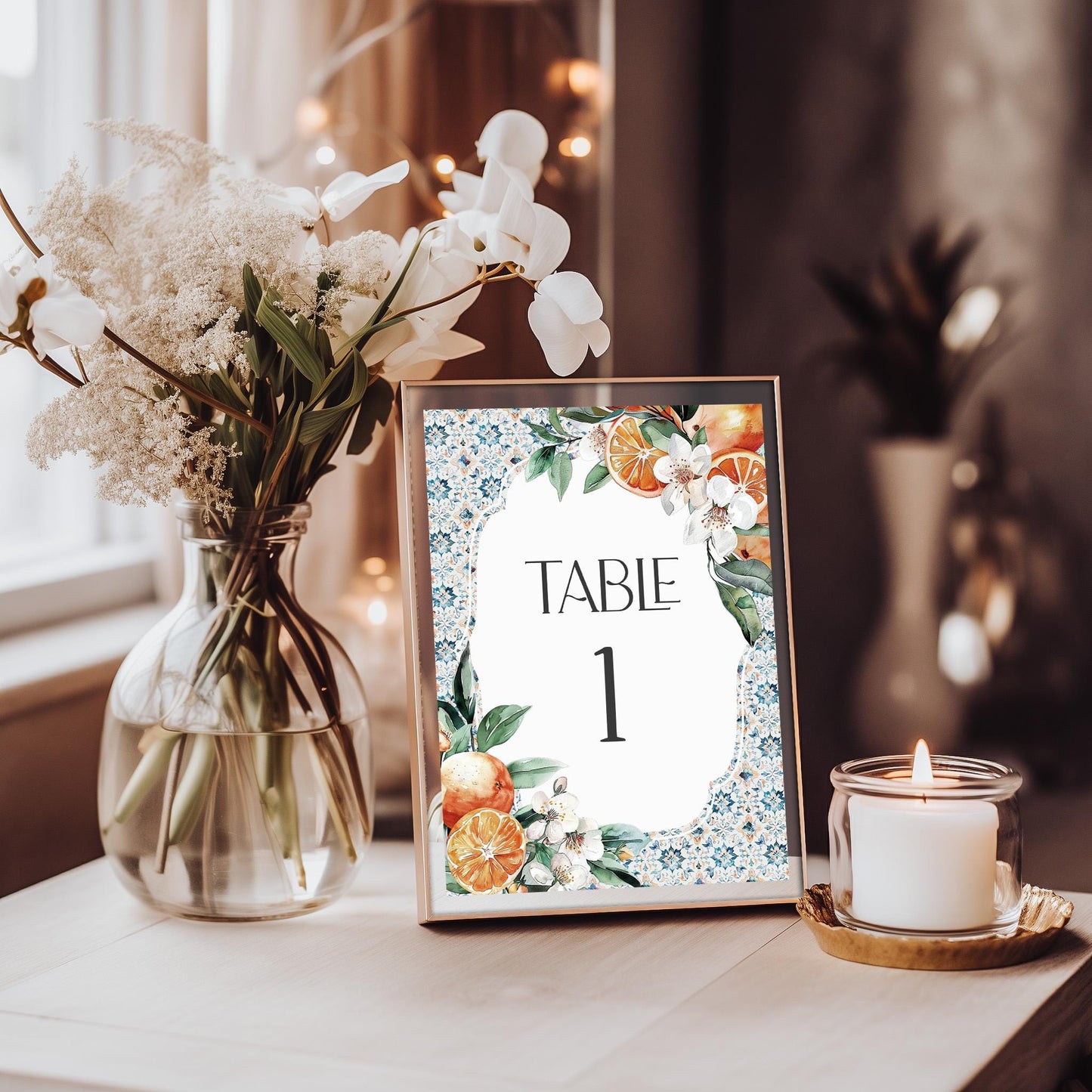 Tuscany Tile Table Number Cards Printable Template, Orange Citrus Mediterranean wedding with Spanish tiles, Italian positano beach theme