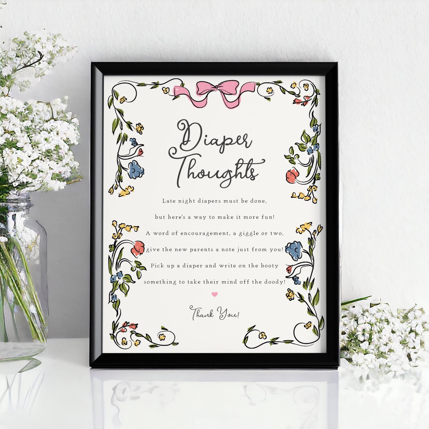 Whimsical Floral Baby Shower Diaper Thoughts Sign Printable Template, Hand Drawn Girl Baby Sprinkle, Retro French Garden Illustrated Doodle