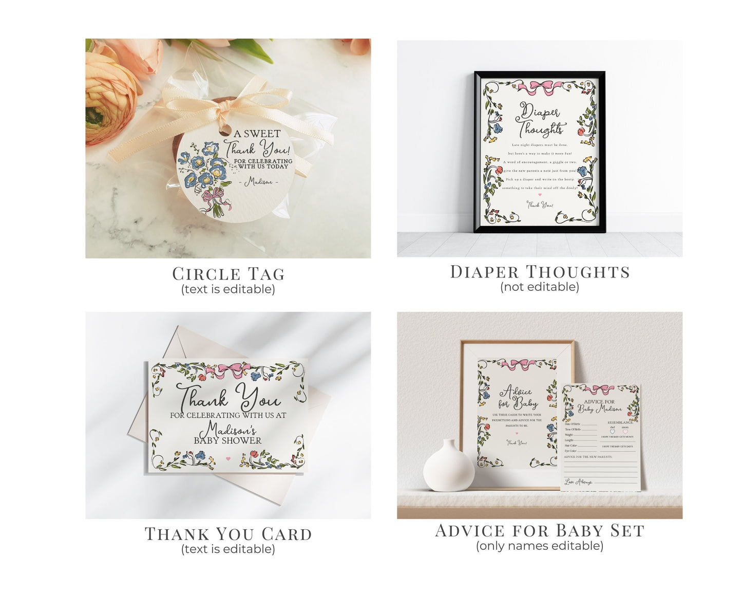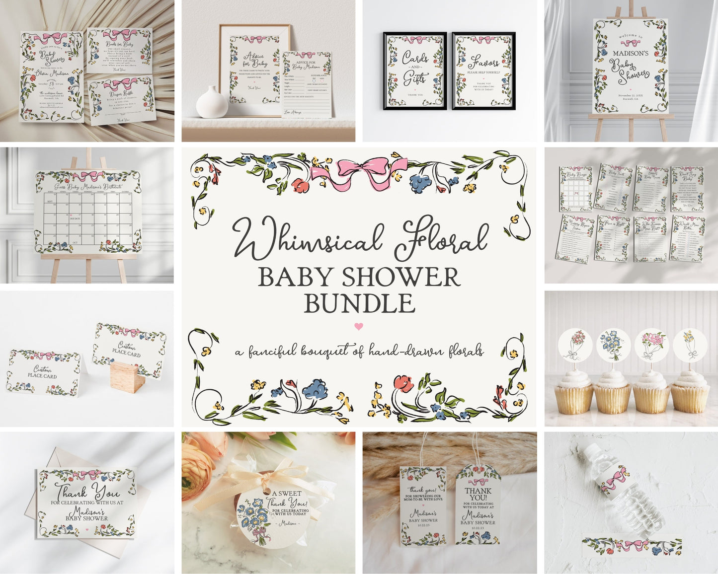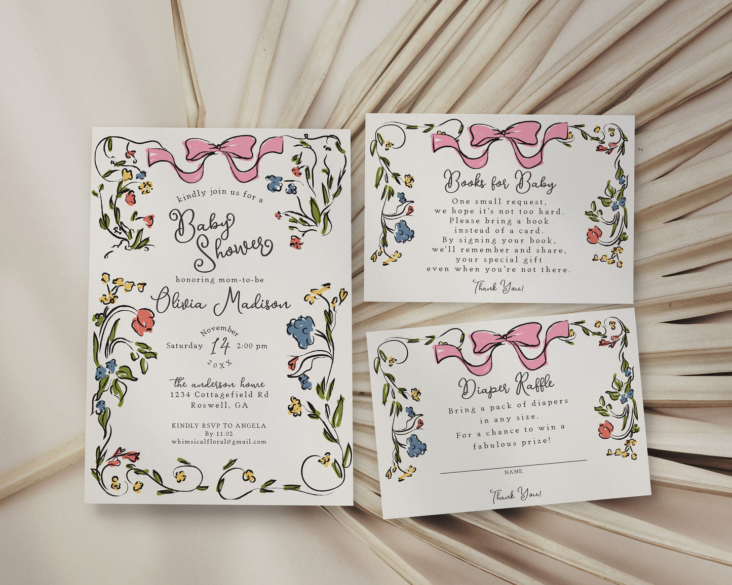 Celebrate your mom-to-be with this fanciful bouquet of hand-drawn florals. This whimsical floral theme is inspired by the charm of a French garden, featuring fanciful wildflower doodles tied with a fresh pink bow.