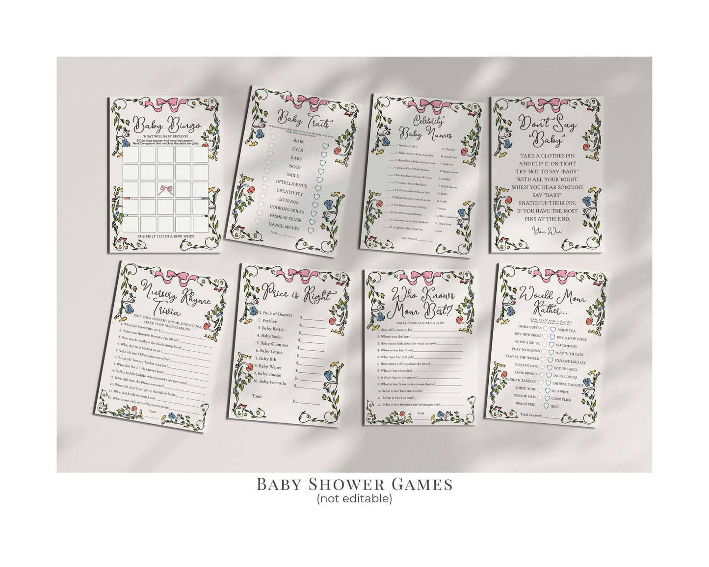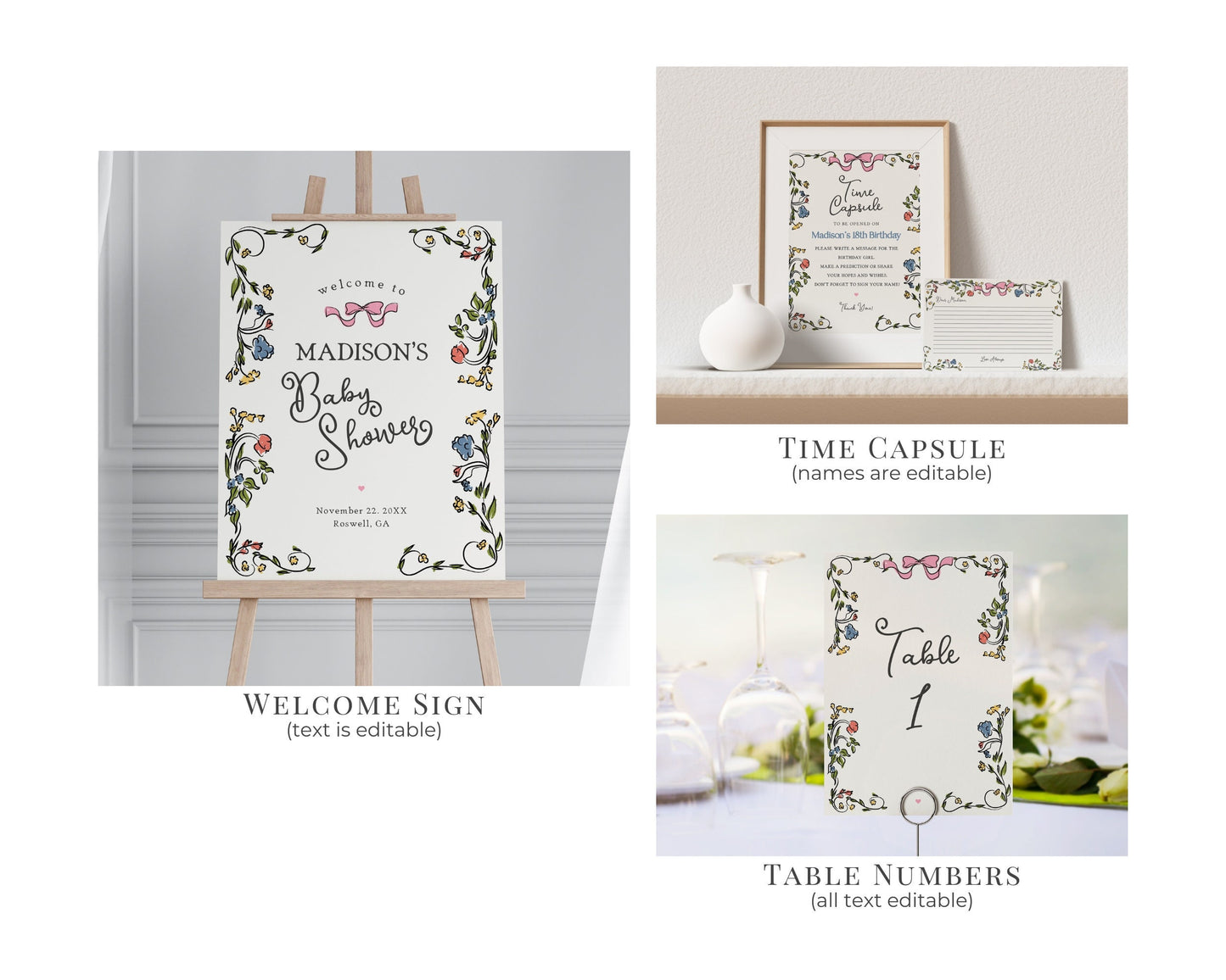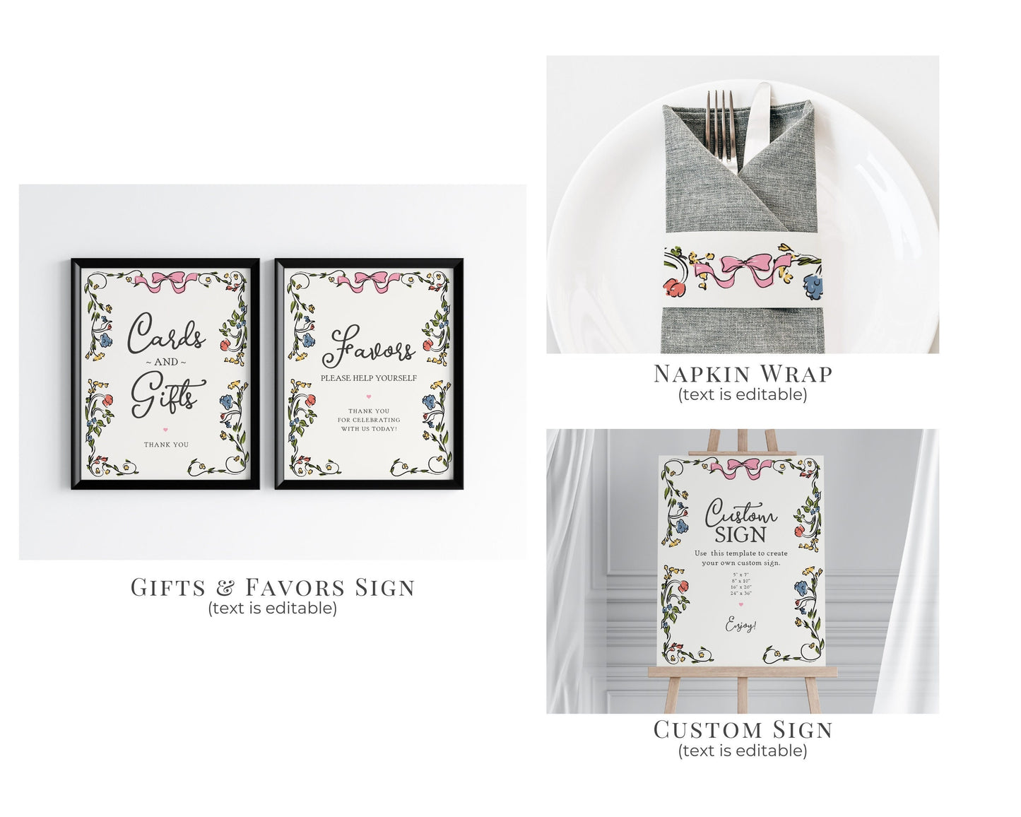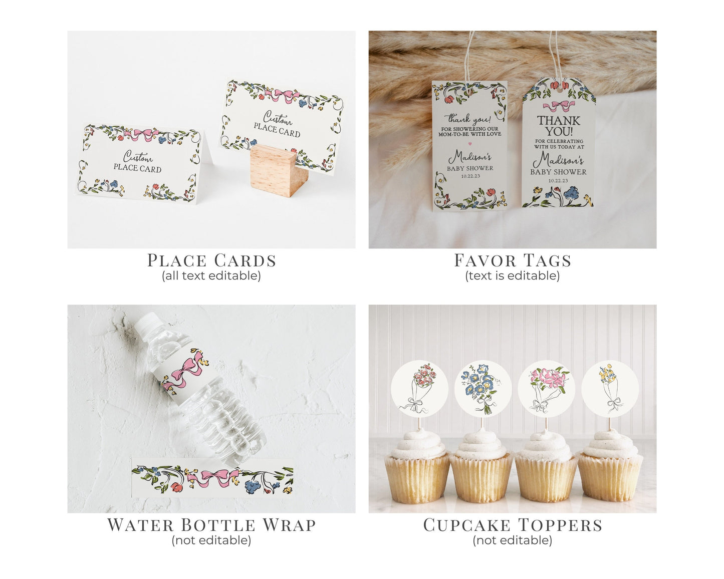 Celebrate your mom-to-be with this fanciful bouquet of hand-drawn florals. This whimsical floral theme is inspired by the charm of a French garden, featuring fanciful wildflower doodles tied with a fresh pink bow.