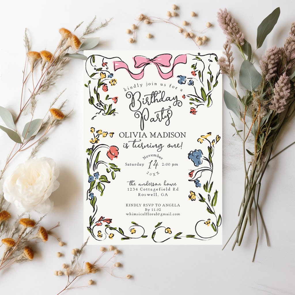 Whimsical Floral Birthday Invitation Printable Template, Hand Drawn Birthday Party for Girl, Retro French Garden Decor Wildflower Doodle
