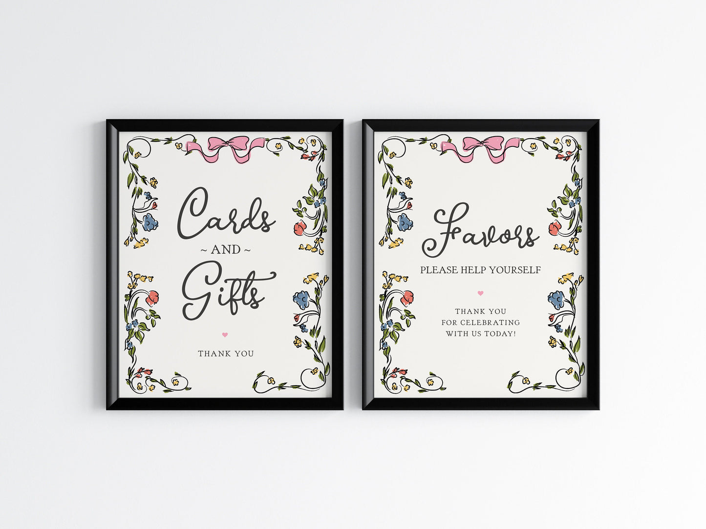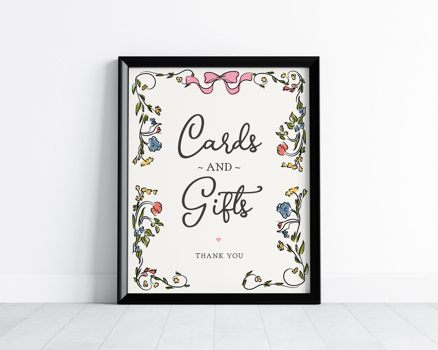 Whimsical Floral Cards & Gifts and Favors Sign Printable Template, French Garden Birthday Party, Illustrated Bridal Decor, Girl Baby Shower