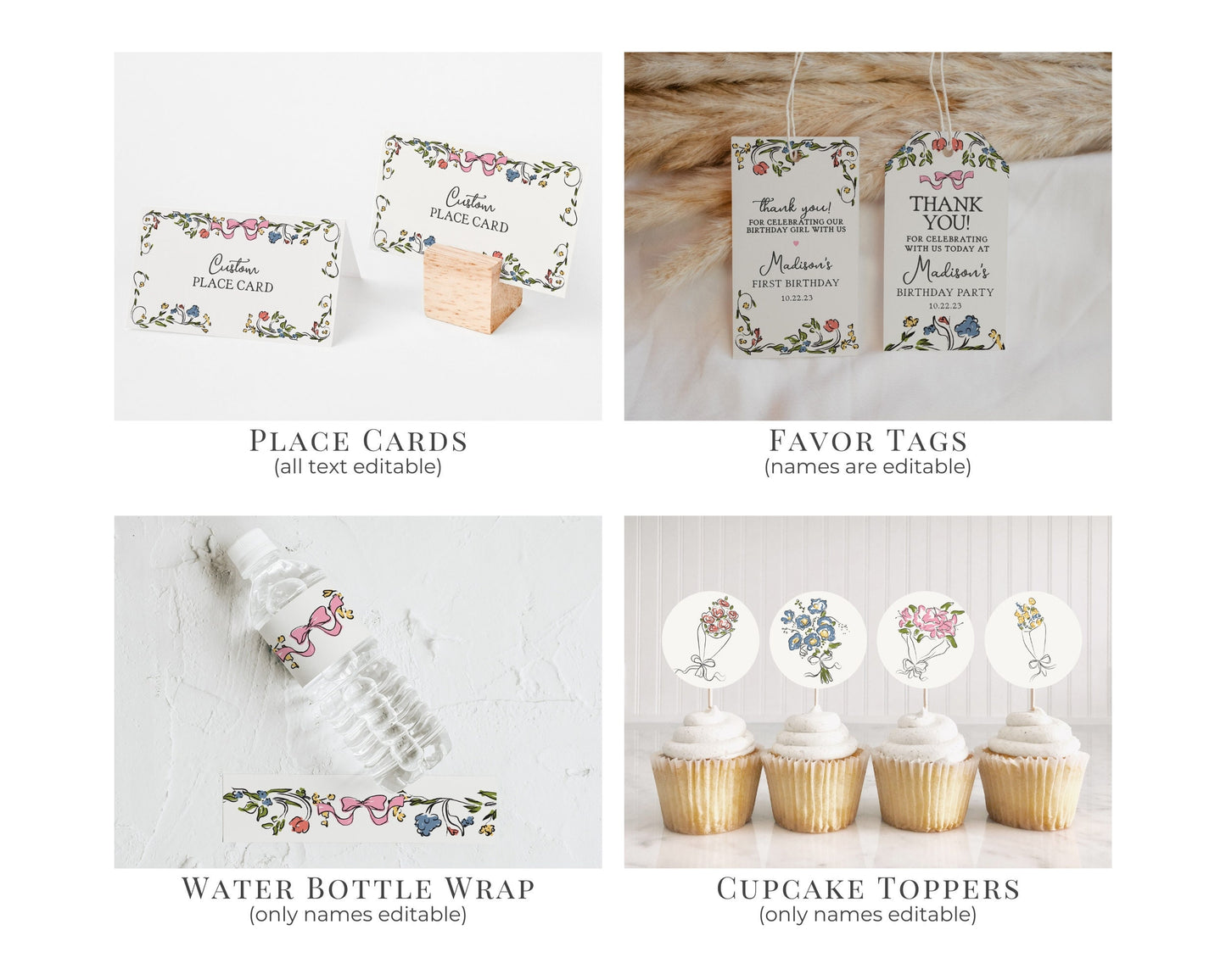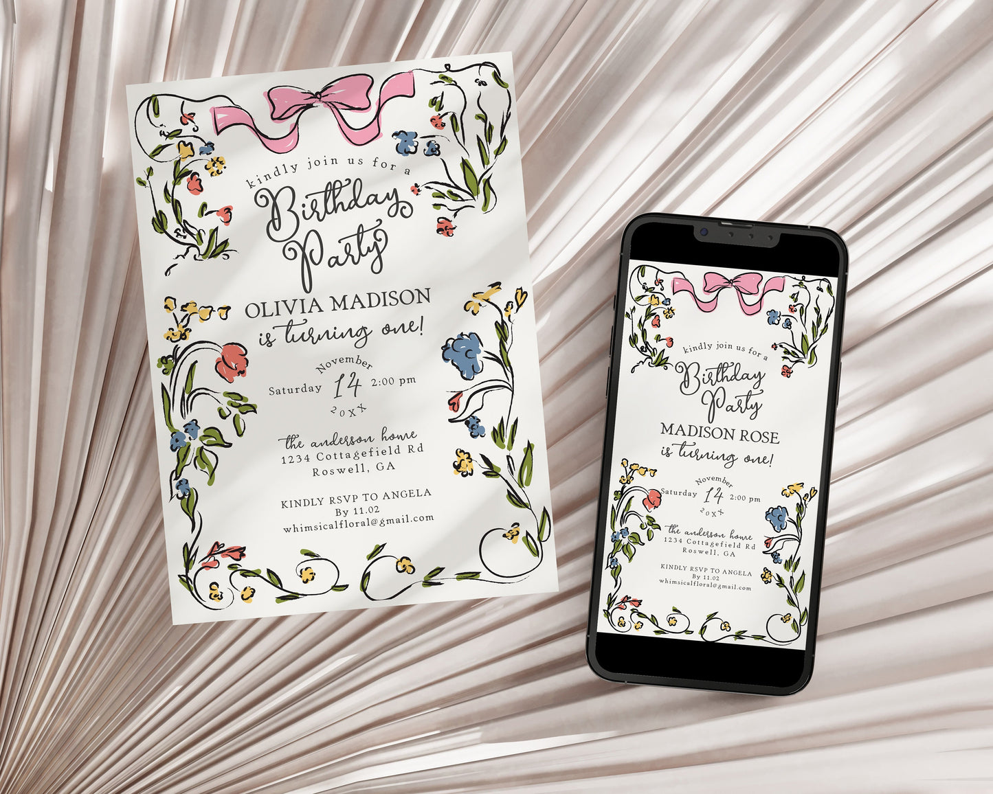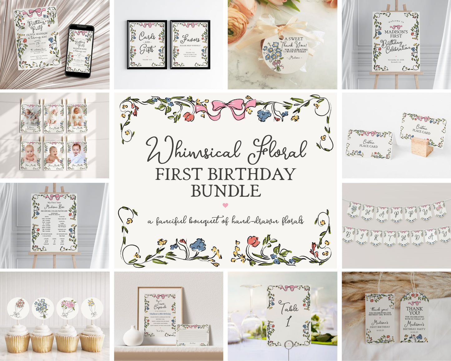 Celebrate your birthday girl with this fanciful bouquet of hand-drawn florals. This whimsical floral theme is inspired by the charm of a French garden featuring fanciful wildflower doodles tied with a fresh pink bow.