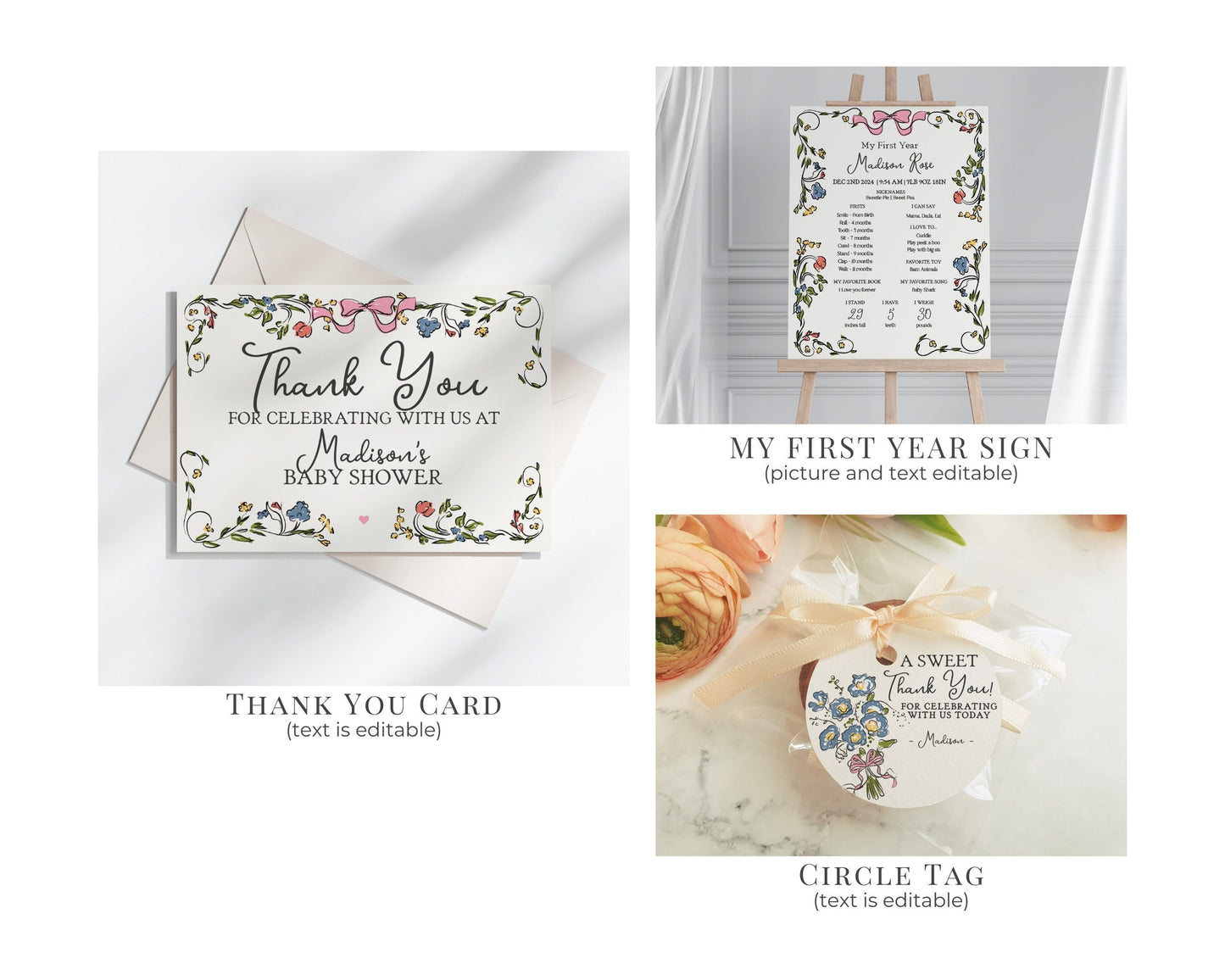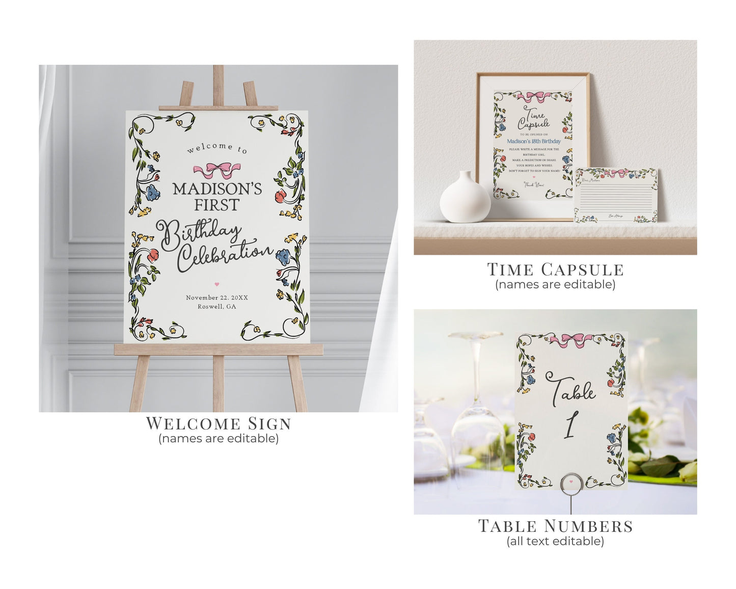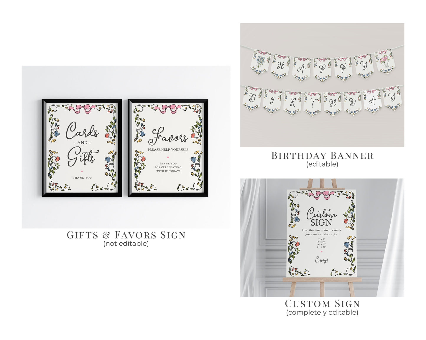 Celebrate your birthday girl with this fanciful bouquet of hand-drawn florals. This whimsical floral theme is inspired by the charm of a French garden featuring fanciful wildflower doodles tied with a fresh pink bow.