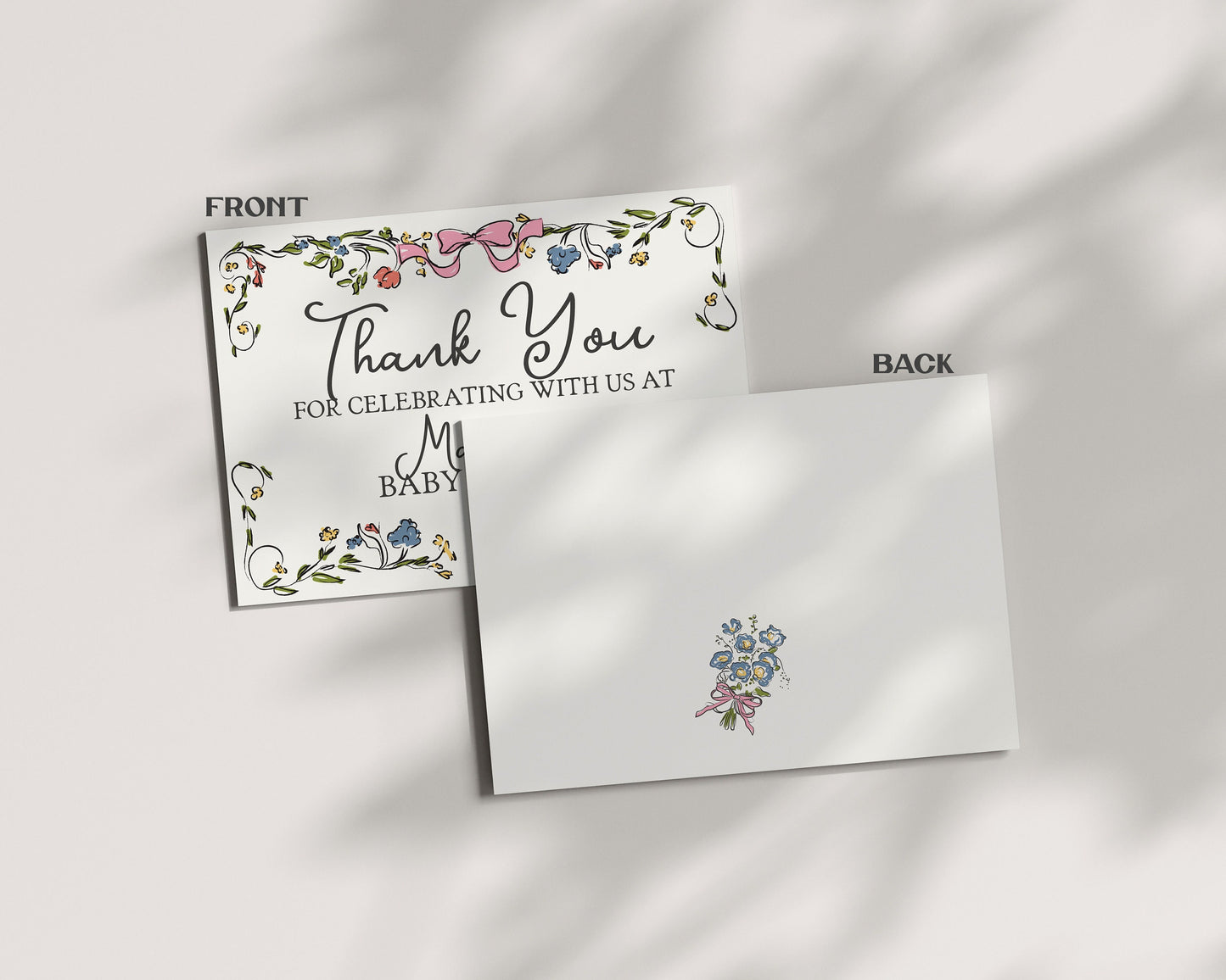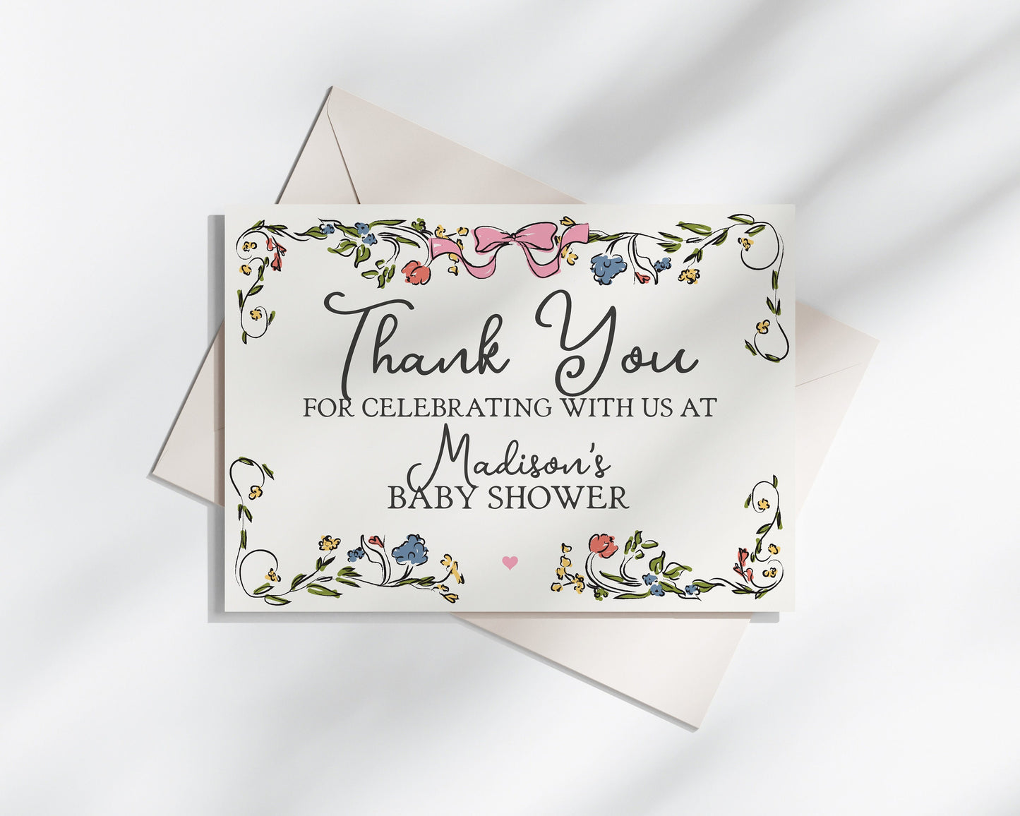Whimsical Floral Thank You Card Printable Template, Hand Drawn Birthday Decor for Summer Retro French Garden Baby Shower or Bridal Shower