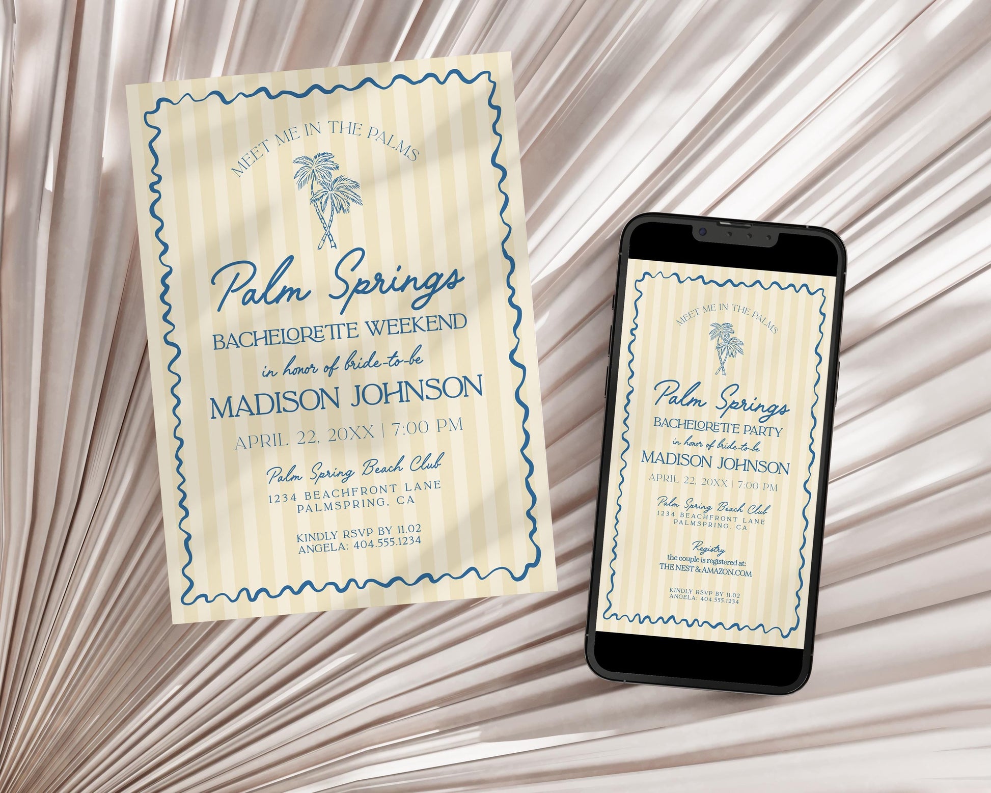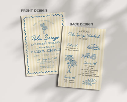 Yellow Palm Springs Bachelorette Party Invitation Template, Vintage Palm Tree Beach Cabana Pool Party Tropical Pastel Last Fling Bach WP1049