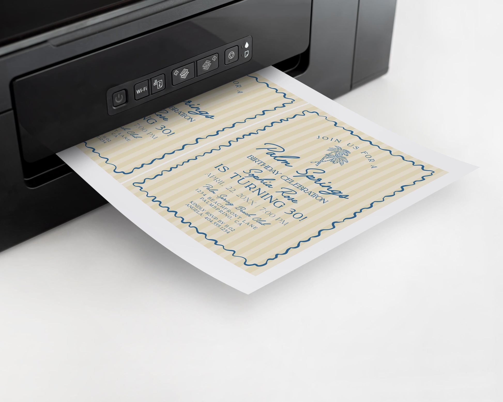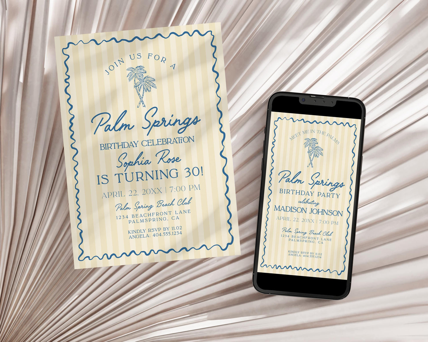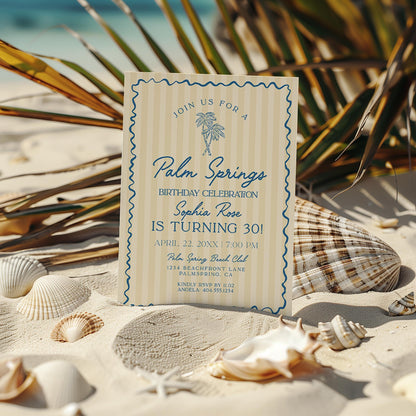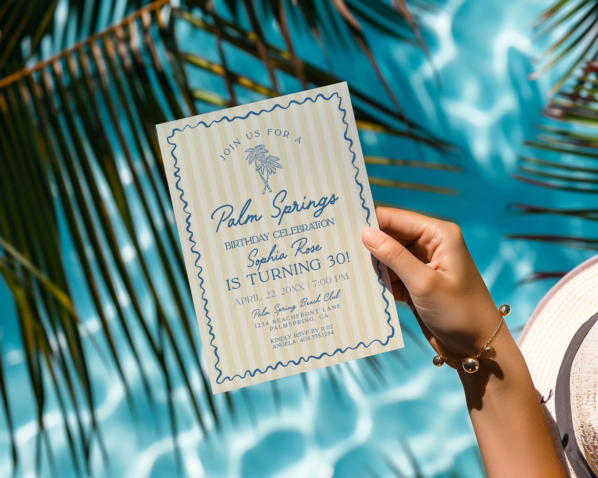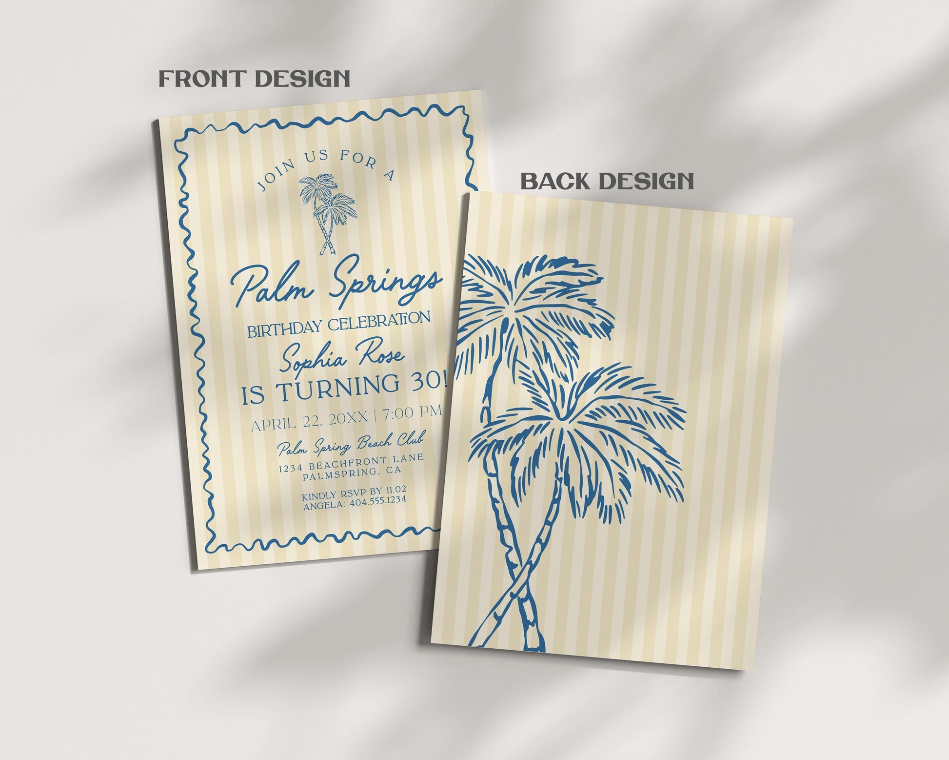 Yellow Palm Springs Birthday Invitation Template, Vintage Palm Tree Beach Cabana Birthday Pool Party, Retro Tropical Pastel Party WP1049